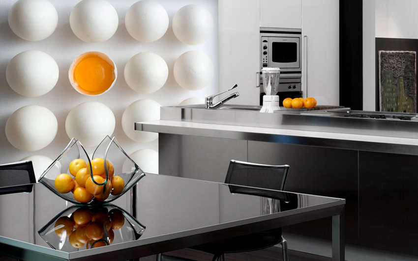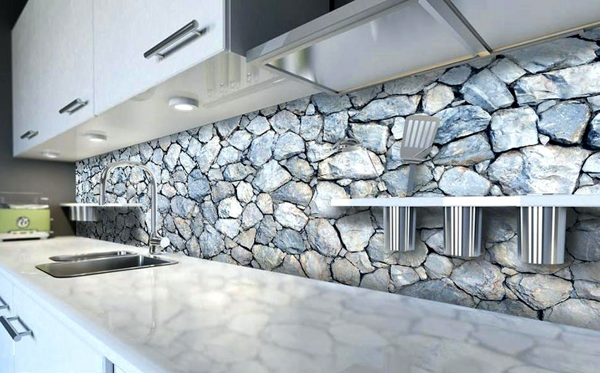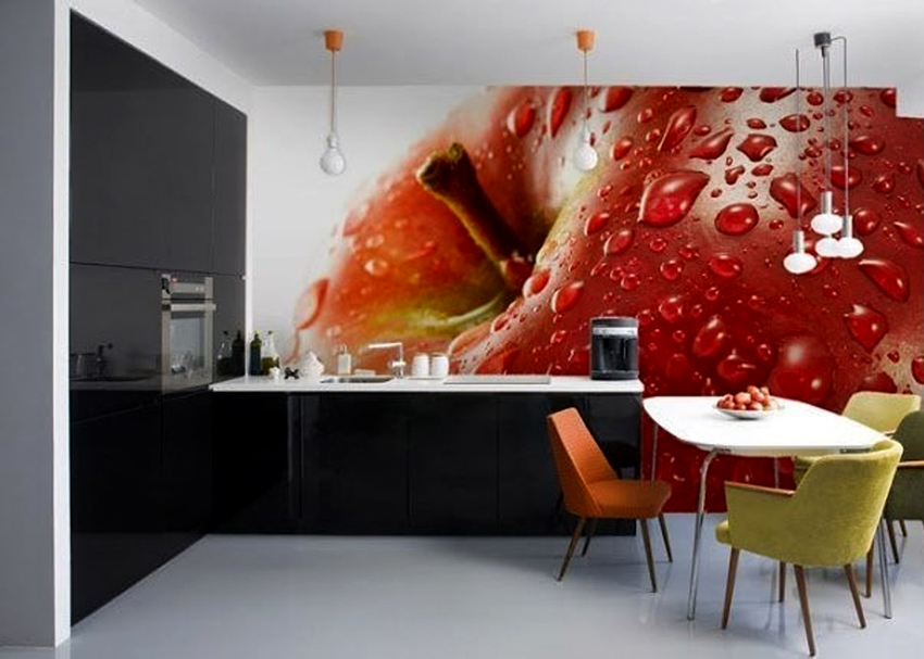 This coating option is presented in a wide variety of species, which is demonstrated in the photo of 3D wallpaper for the kitchen. This makes it possible to choose a product that matches any design. Photo wallpaper 3D is characterized by increased resistance to moisture, temperature fluctuations, exposure to sunlight, and thermal stress. They are easy to care for and easy to clean. The disadvantages of this coating include their high cost.