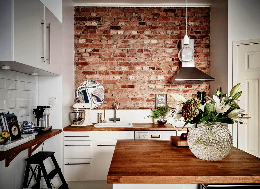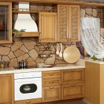Photo wallpaper can be used to fill the workplace in the apron area. For this, products with imitation of wood, stone, brick wallpaper in the kitchen are suitable. In this case, tempered glass should be glued to the wallpaper. Such protection will help preserve the image in its original form for a long period.