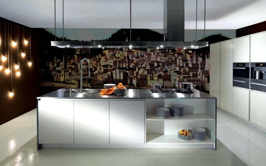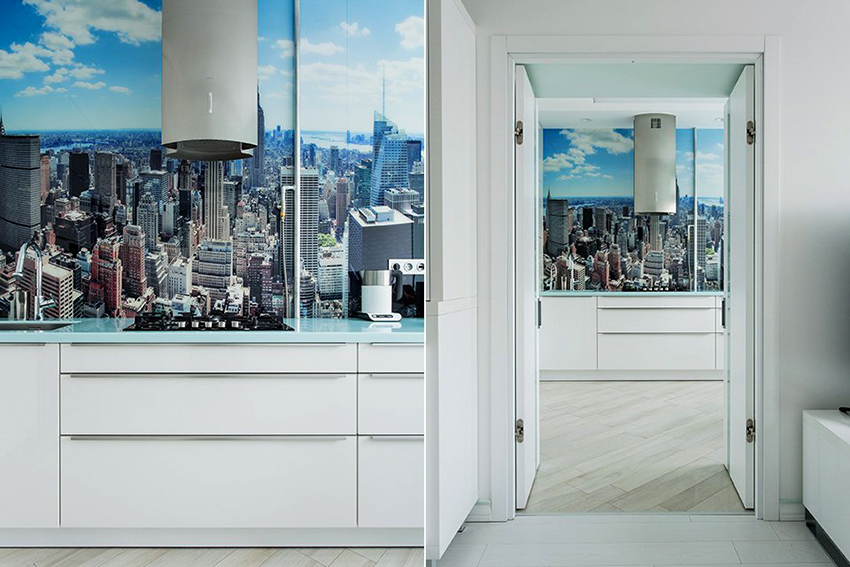 Urban images are suitable for a modern kitchen interior. It can be famous world sights, spacious crowded squares, noisy boulevards and city bazaars. Photo wallpapers, which depict fragments of architectural objects, look original. Such compositions are capable of transforming an ordinary setting into something special.