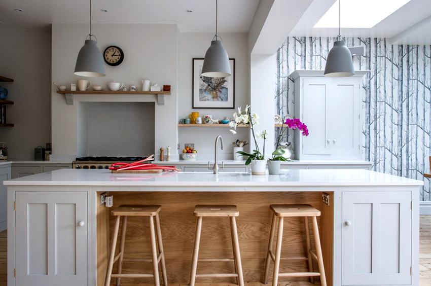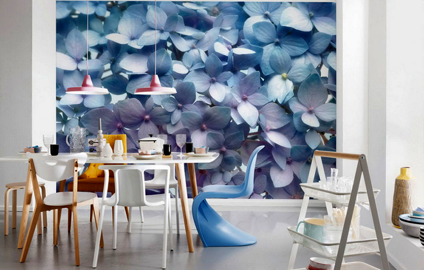 For a kitchen with a southern orientation, you can choose wallpaper in cold colors. Blue, lilac and sky-blue colors will bring natural freshness and coolness. In addition, these shades contribute to the visual expansion of the space, as shown in the photo of the kitchen design with photo wallpaper. Relevant for a small room are canvases depicting the endless sky, water elements or mountain themes.