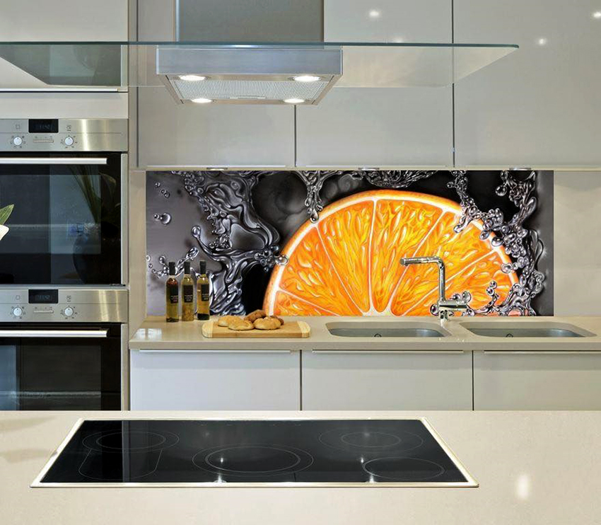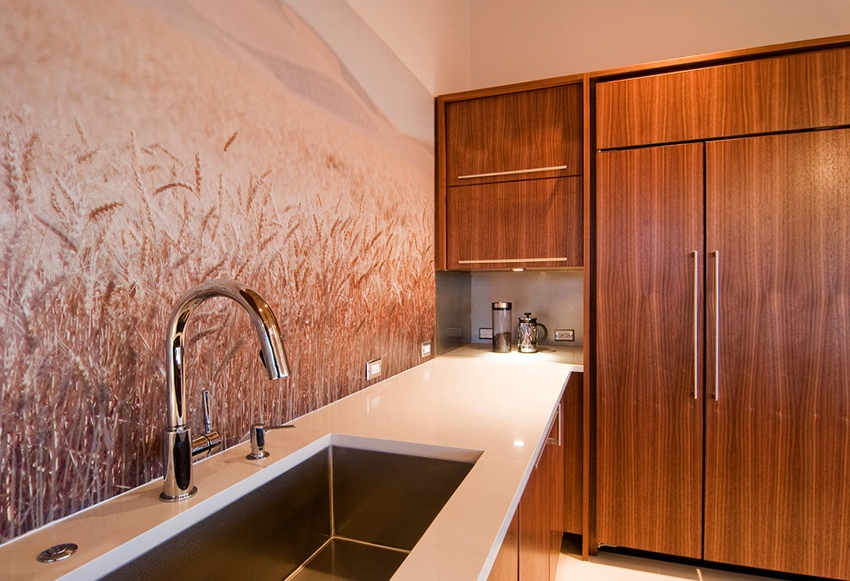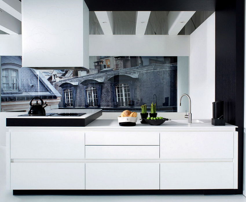 Important! When decorating the working area with photo wallpaper, the canvas should be additionally covered with tempered glass. This will extend the life of the product without losing its attractive appearance.