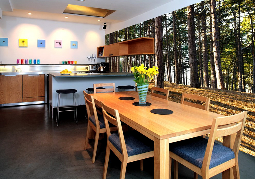 Most often, the wall near the table is pasted over with photo wallpaper. Thus, it is possible to highlight the dining area, as shown in the photo wallpaper in the kitchen near the table. The design of the window or door area with this type of coating looks interesting. In order not to deprive the room of comfort, making its interior strange and ridiculous, you should not paste over a narrow wall in the kitchen with photo wallpaper.