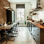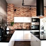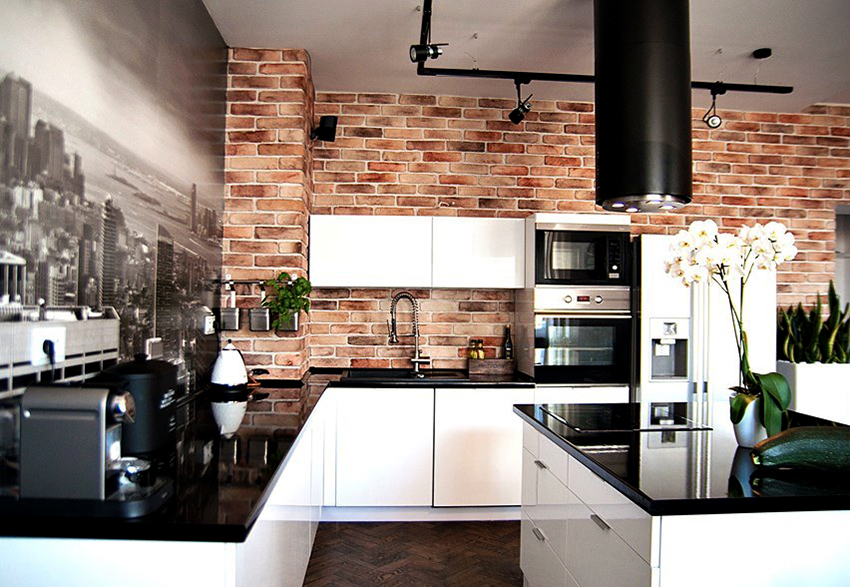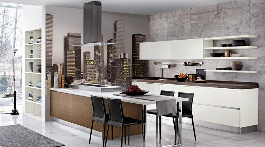 Loft-style kitchens are often decorated in a gray color palette. For the largest and most open wall, you can choose a photo wallpaper in black and white. Images of New York skyscrapers, a panorama of a night city, a view of a huge bridge, picturesque arches, as shown in the photo of the kitchen with photo wallpapers, will organically fit into the mysterious loft. The fake wallpaper with the image of shelves with kitchen utensils will look relevant.