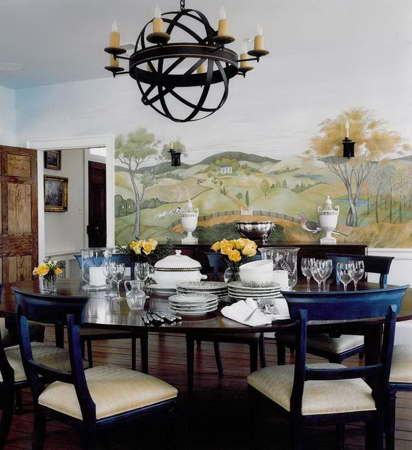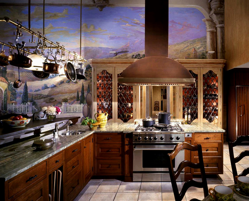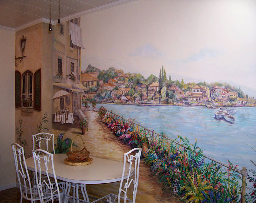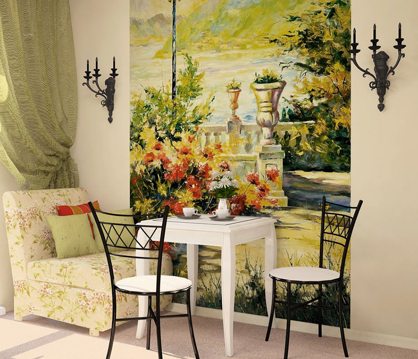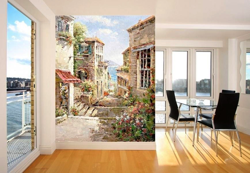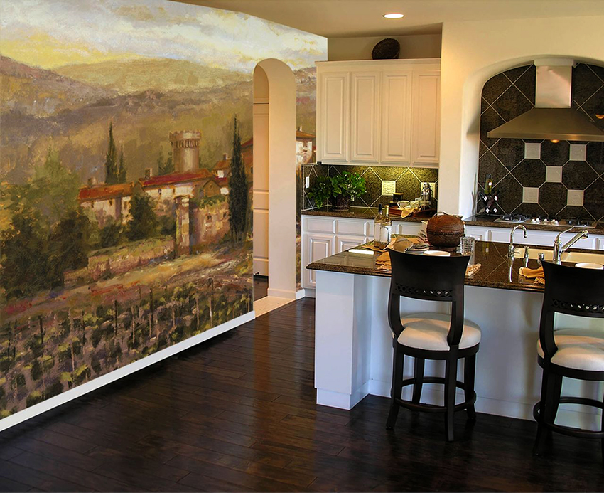 Picturesque wall murals will perfectly fit into the interior of the kitchen in country or Provence style