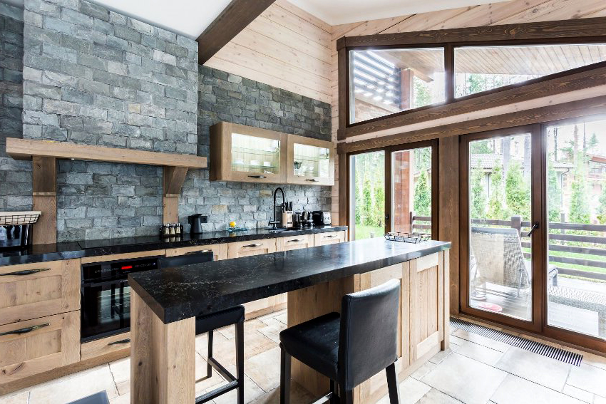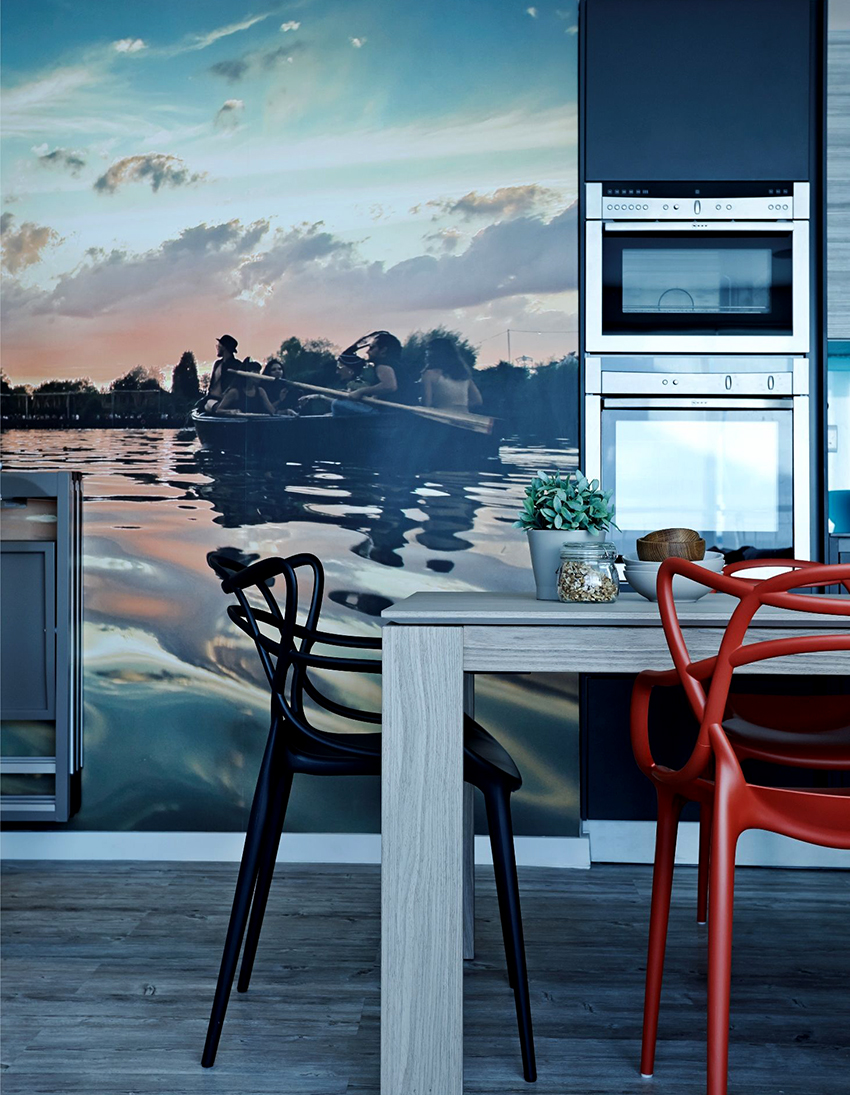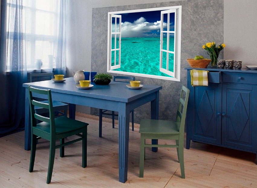 Wall murals with false windows and false doors will visually add additional space to the kitchen. Windows can be depicted with a frame, behind which a landscape of a lake, garden, forest, sea coast opens. The original idea of wallpaper for the kitchen is an imitation of a door with an exit to a balcony, from which a panorama of the city opens.Such paintings are a kind of portal, thanks to which you can be transported to another place.