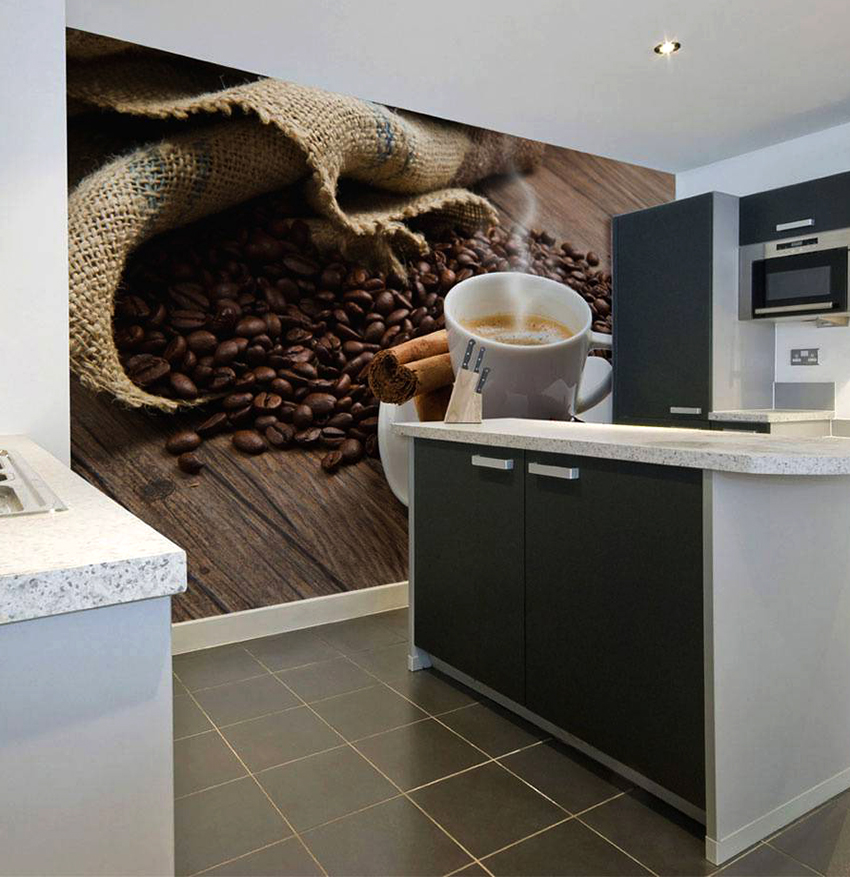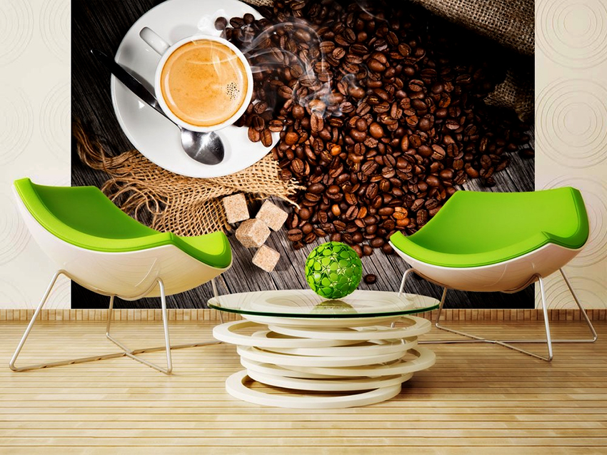 Enlarged coffee beans or spikelets of wheat look stylish and original. Different options are shown in the photo wallpaper for the kitchen.