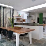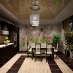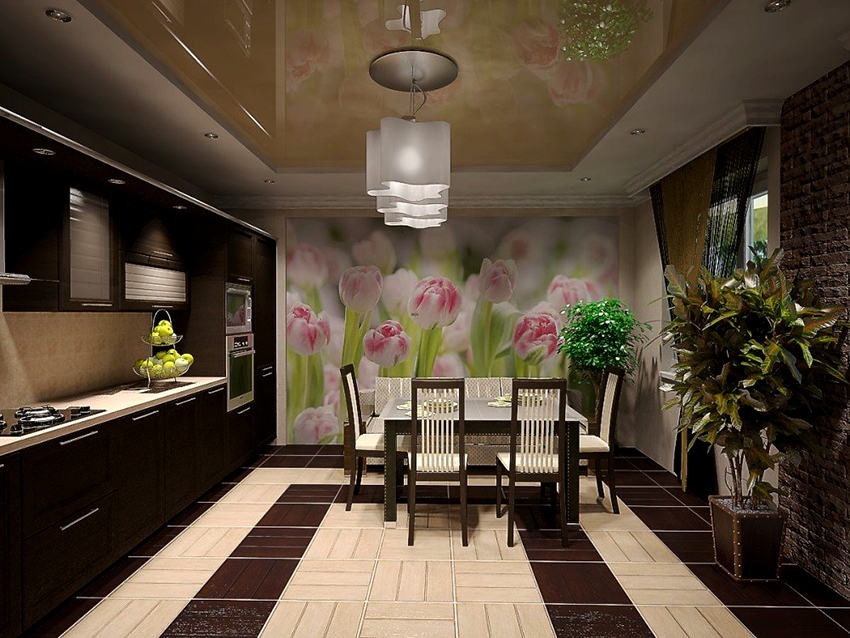 The interior of the kitchen with photo wallpapers located on the ceiling looks original and non-trivial. For this, PVC products are used. Coverings with plant and flower motifs will be appropriate in this area. A single large element looks unusual and attractive, which casts a shadow from itself, creating a three-dimensional illusion.