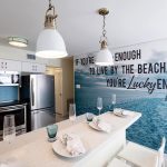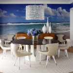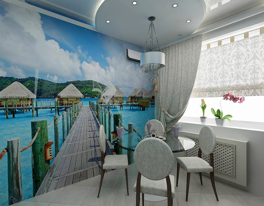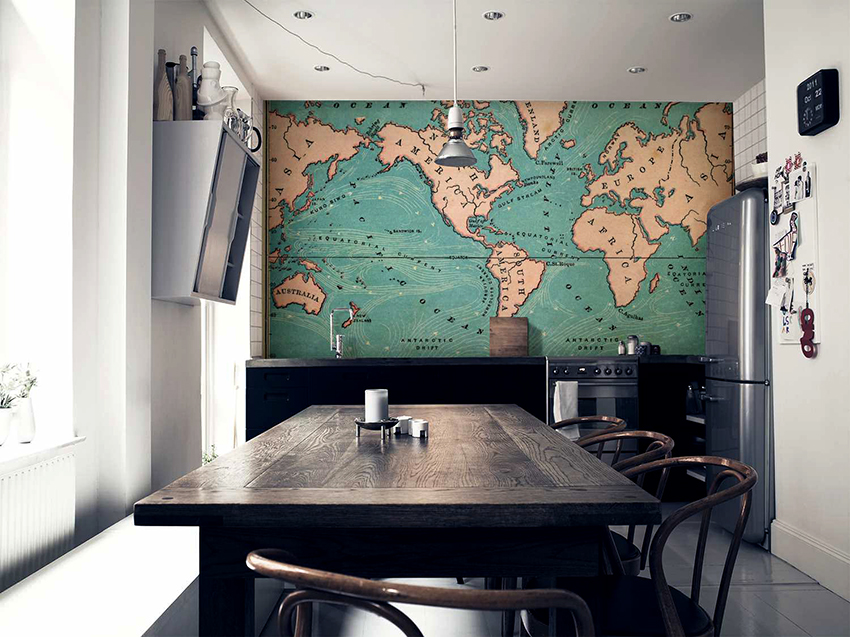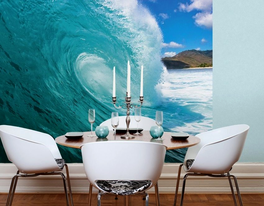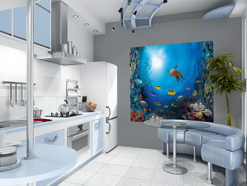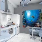 Products with sea views are very popular, as shown by photos of wallpaper design in the kitchen. They will appeal to any person. This image will fill the atmosphere with calmness and give a feeling of deep peace. It can be an azure endless surface or a calm sea with an island, a pirate ship. The images of the depths of the sea with colorful reefs, multi-pass caves, sunken objects and various inhabitants look mysterious and mysterious, as shown in the photo of the kitchen design with photo wallpaper on the wall.