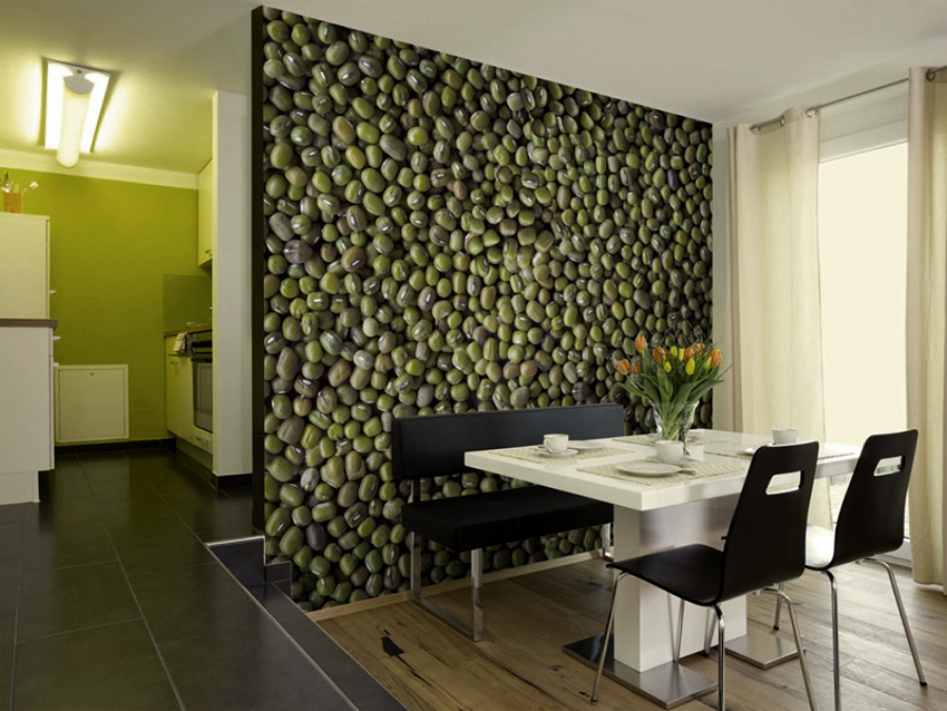 When choosing a wallpaper with a 3D effect, you need to focus on the size and lighting of the room. For a small kitchen, you should not choose large images cluttered with small details. This option is best used in a spacious kitchen.