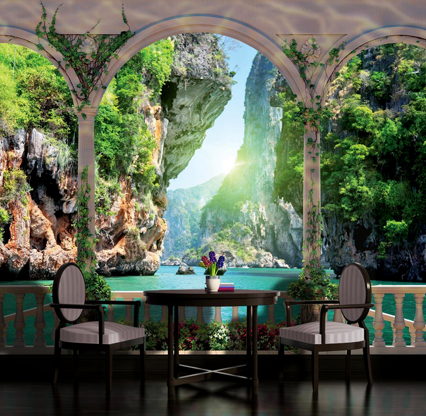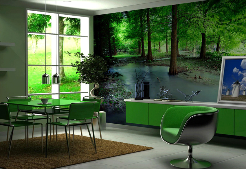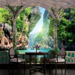 The picturesque design will help you escape from the urban reality and enjoy the natural oasis.For this, compositions are used with the image of a sunset or sunrise, heavenly blue, lakes, deserts, waterfalls and rocks.