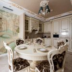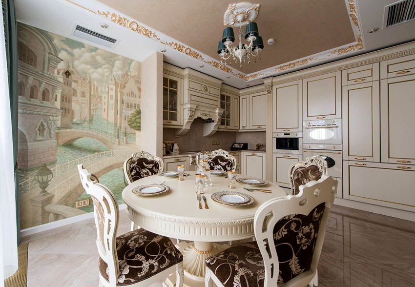 Wall murals depicting flower meadows, climbing plants, gazebos, flower arrangements in vases will fit into the classic kitchen interior. Pictures of landscape themes will also look appropriate. The general concept will be successfully complemented by images of cozy Italian courtyards, luxurious terraces of royal palaces.