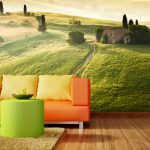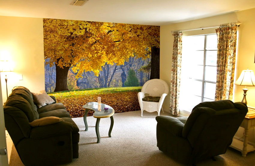 Useful advice! Warm colors in interior landscapes set up a friendly relationship, therefore they are recommended for the living room. A vivid example is a photographic landscape of an autumn park or wallpaper the sun.