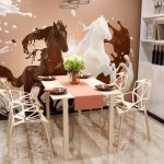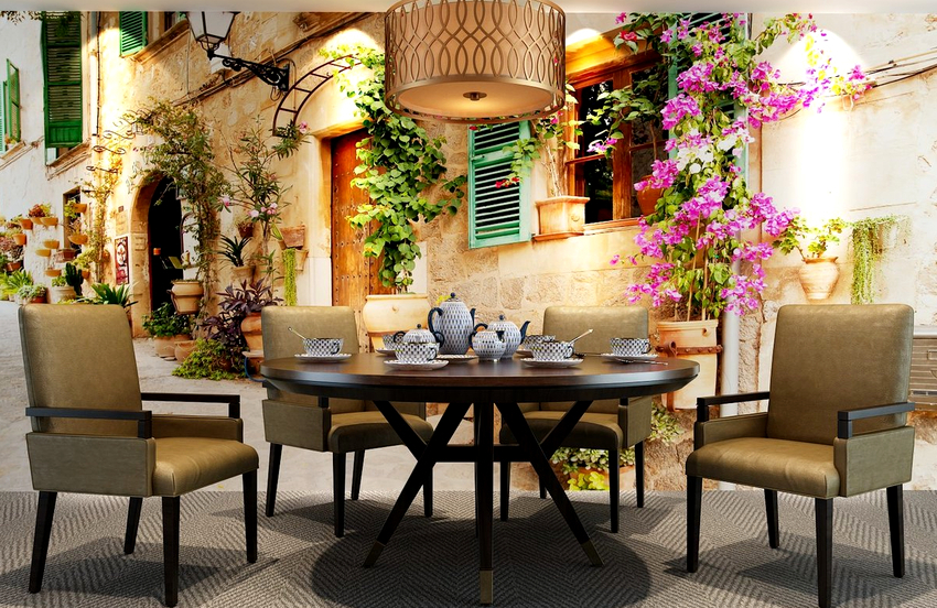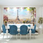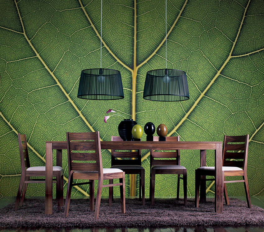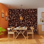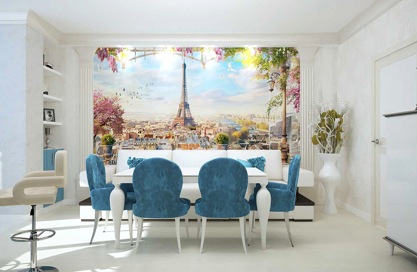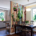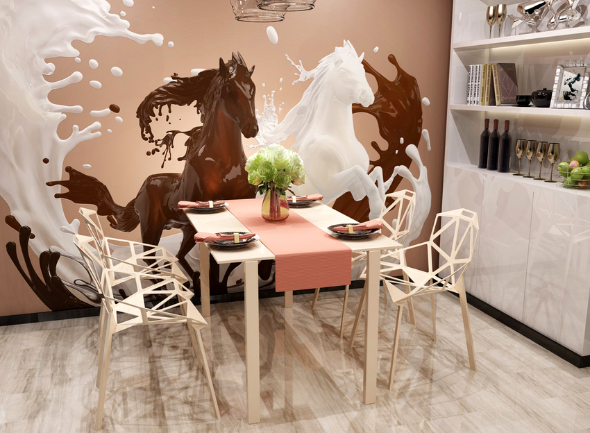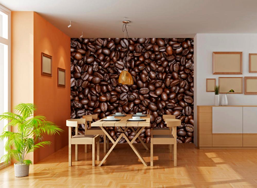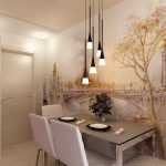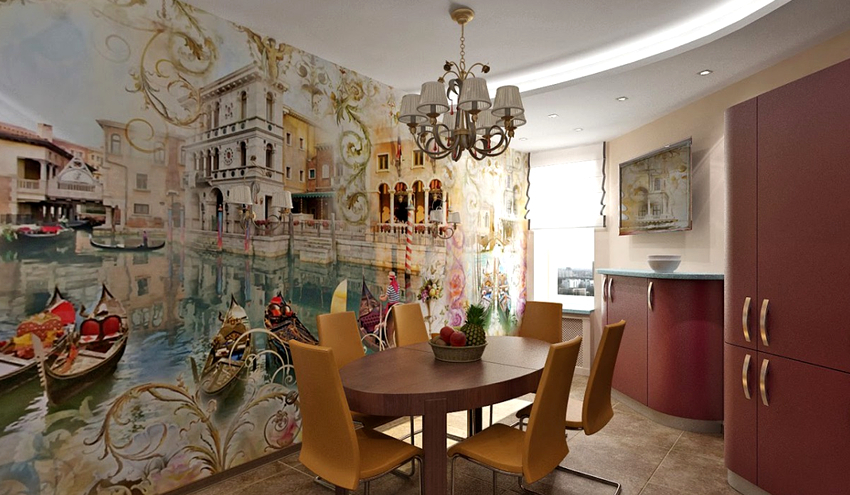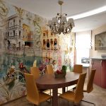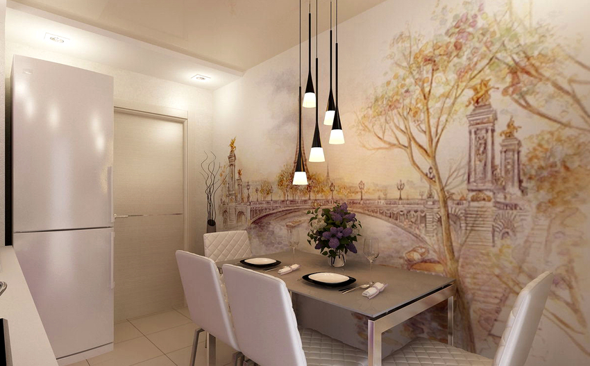 Beautiful wallpapers or landscapes will be a great addition to the wall in the dining area. In this case, it is recommended to arrange furniture in such a way that it does not overlap the drawing. It is also important to match the style of wallpaper in the interior. Only in the case of correct application of photowall-paper can you achieve an excellent result. Numerous photos on the Internet will help you choose the best option.
