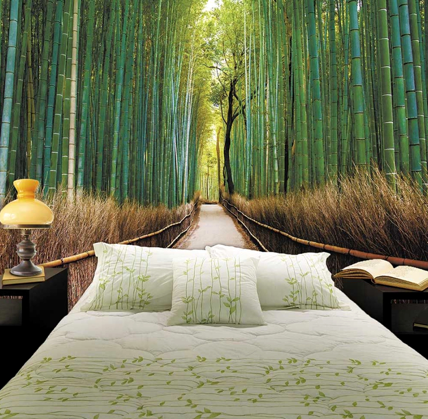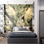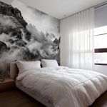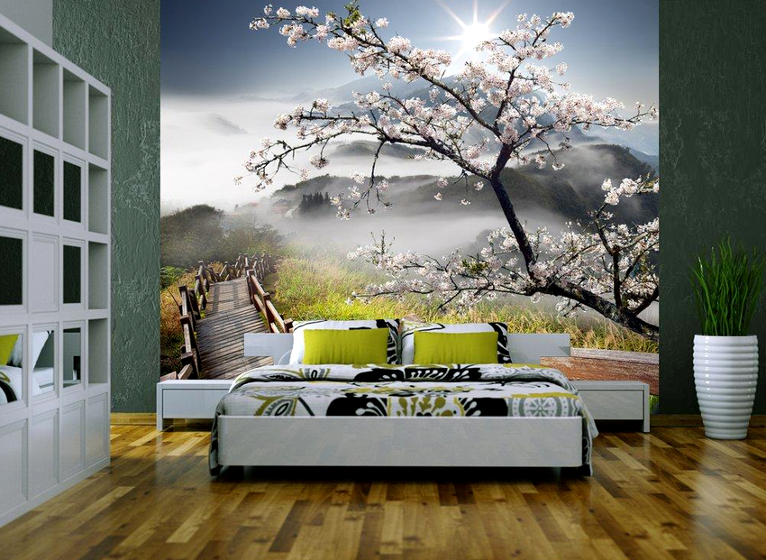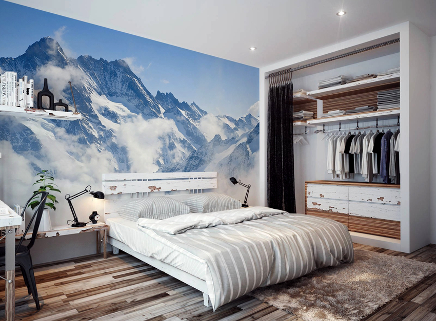 Wallpaper in the bedroom most often placed above the head of the bed. The canvases visually separate it from the rest of the space, thus denoting the sleep zone. Moreover, a photographic image can become a beautiful and harmonious continuation of the bed headboard.