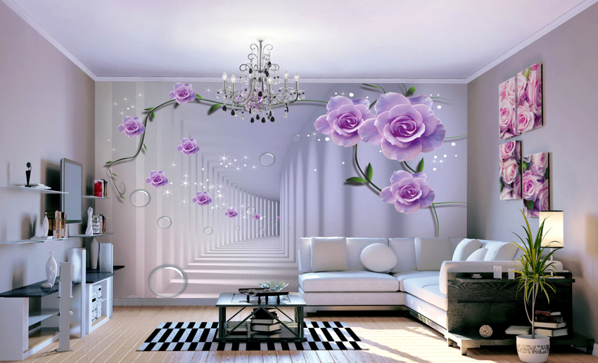 Using the queen of flowers as images on the walls will also help visually expand the space, so they are often chosen for decorating small rooms. Painting with roses on high legs will help to visually raise the ceilings in the room. Black and white flowers with one bright scarlet bud will create the main accent in the room and, thus, contribute to its zoning.