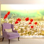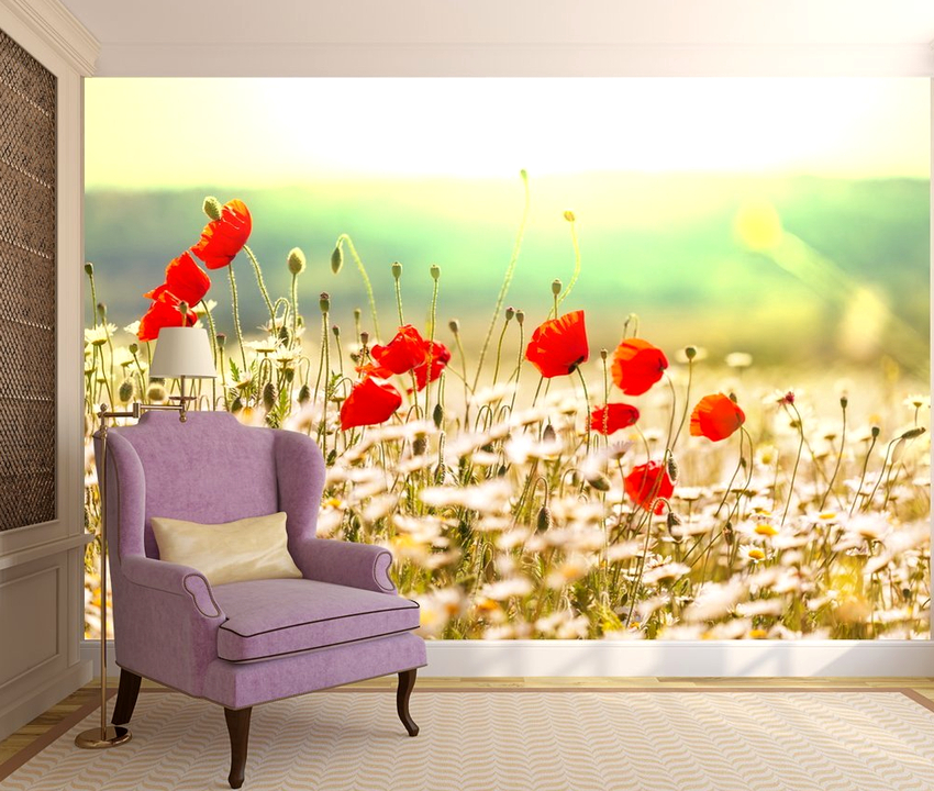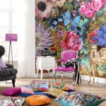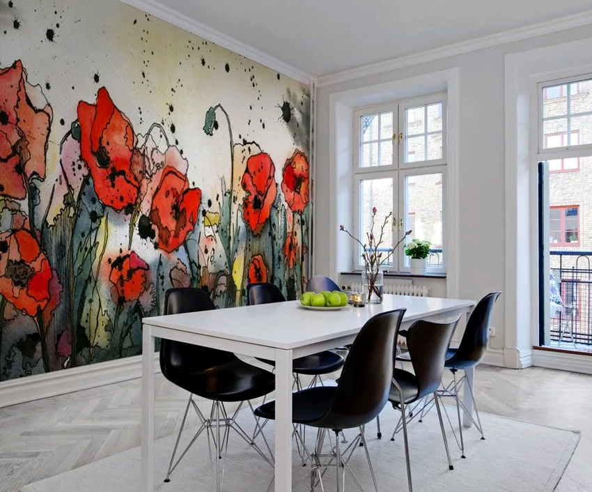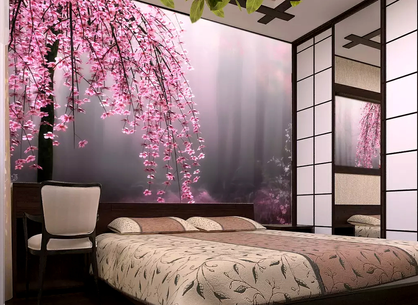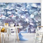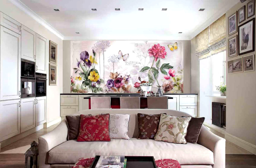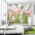 Each style can be matched with its own special floral print. So, pastel colors will appeal to romantic natures, and catchy and bright images will appeal to expressive and creative personalities. Flowers are also suitable for ethnostyle, for example, branches of blossoming sakura will favorably emphasize the Japanese style. Wild flowers such as cornflowers, poppies, dandelions or daisies will add a breath of freshness to the interior against the background of green grass. Wall murals depicting tulips, lilacs, lilies and irises will create lightness and spring mood.