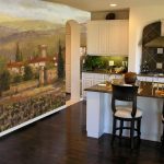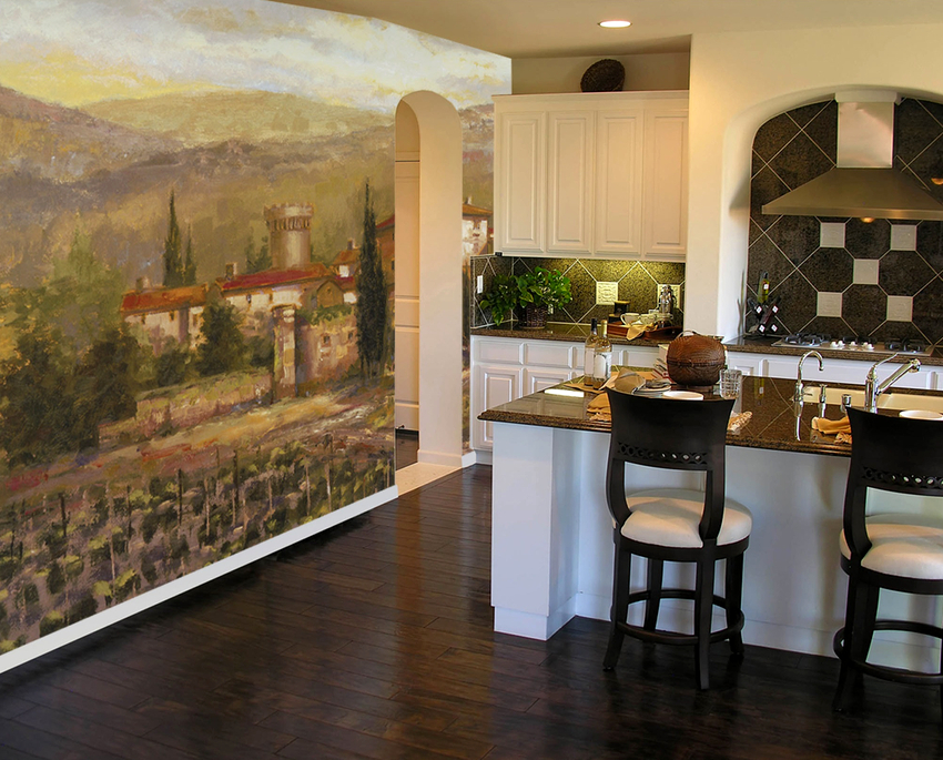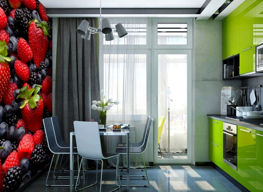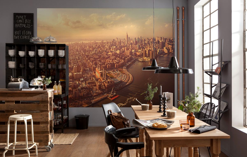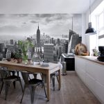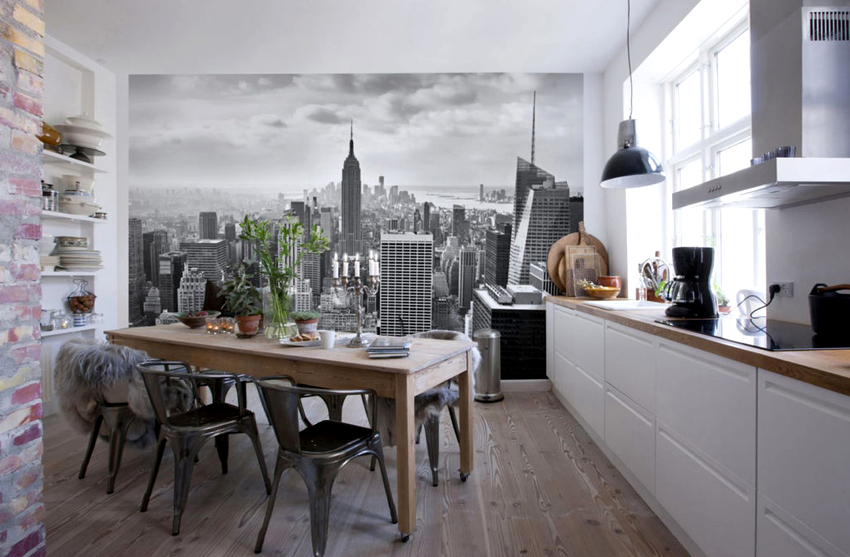In modern kitchens, wall murals are most often used in the form of skins, which are located in the apron area. This option of decorating the working area with beautiful black and white drawings of the night city or photographs of juicy berries and fruits has been very popular lately. In spacious kitchens, you can decorate the dining area with photo wallpaper.
