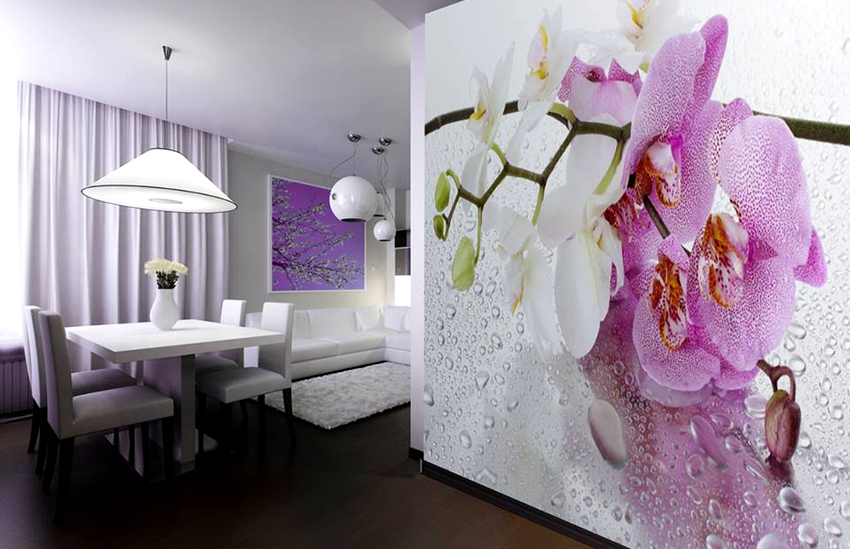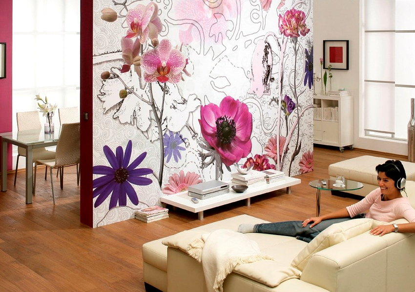 With the help of images of flowers, you can easily create the most diverse atmosphere in a house or apartment. For example, pastel colors in the form of orchid buds, cream roses or pink sakura will add tenderness and lightness to the interior. Another plus of floral motifs is their versatility, as they are suitable for the design of different rooms, such as a living room, nursery, bedroom or corridor.