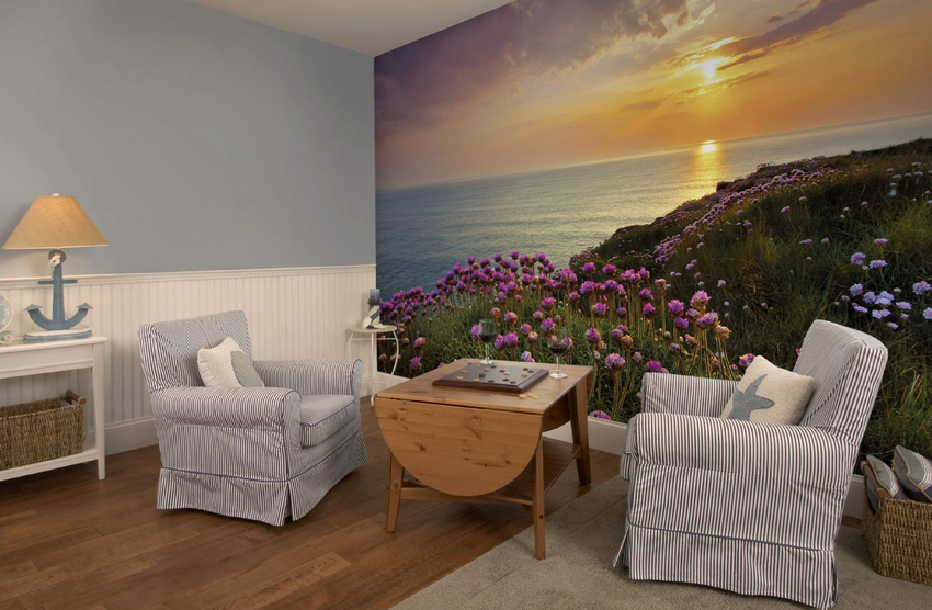 Reproductions by marine painters such as Aivazovsky, Kuindzhi and Repin are in keeping with both classical and nautical styles. Sea lovers can make custom-made photomurals by choosing the desired plot of the corresponding theme. Wallpaper depicting a foamy sea, delicate pebbles or a sea sunset will bring freshness and comfort to the living room.