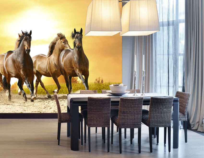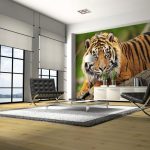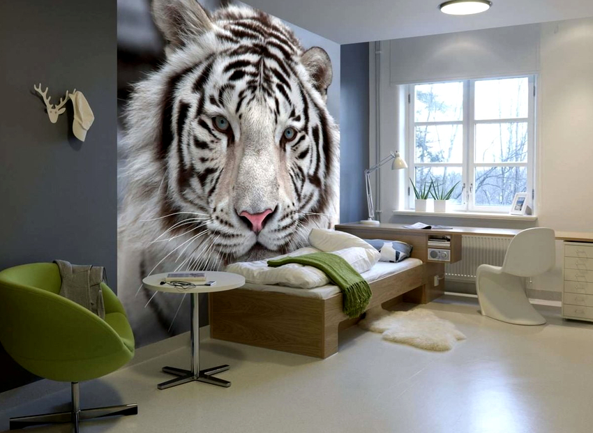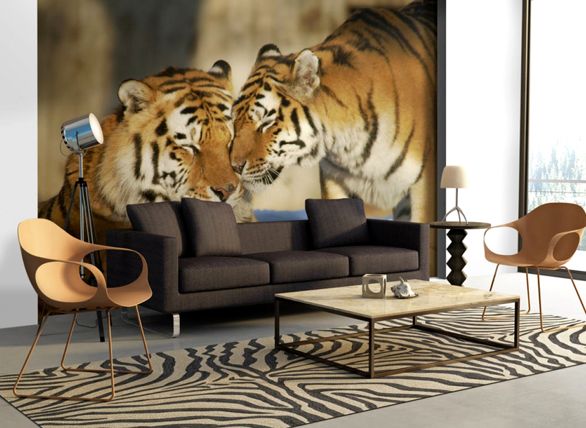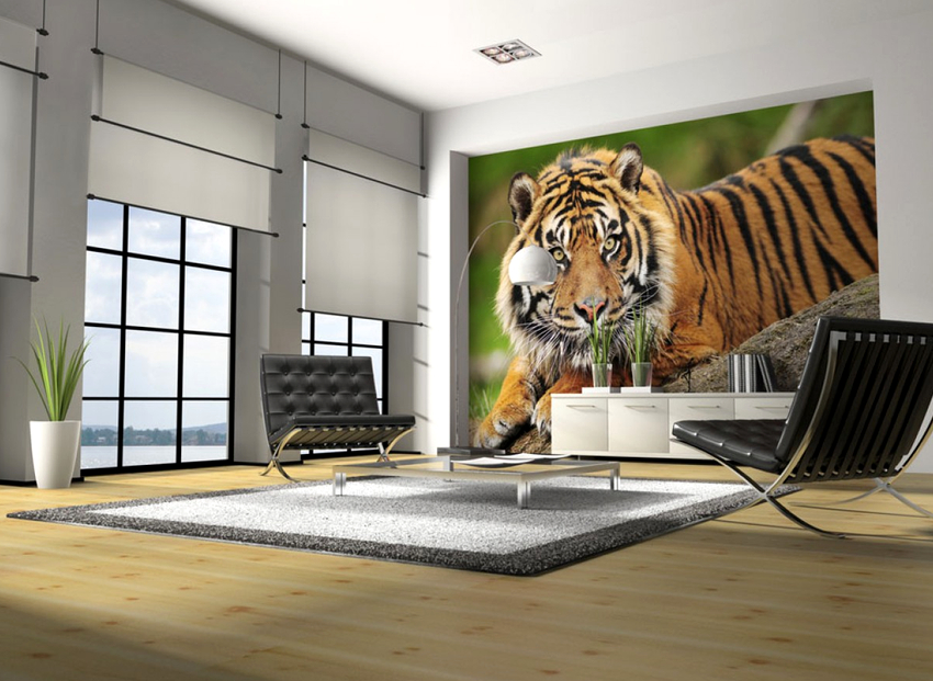Wall murals depicting animals will create a cozy atmosphere, filling the interior with bright colors, positive emotions and the energy of nature, skillfully emphasizing the stylistic orientation in the design of the room. Modern manufacturers offer the widest selection of dynamic scenes and colors. Such colorful and dynamic paintings will transform even the darkest room.