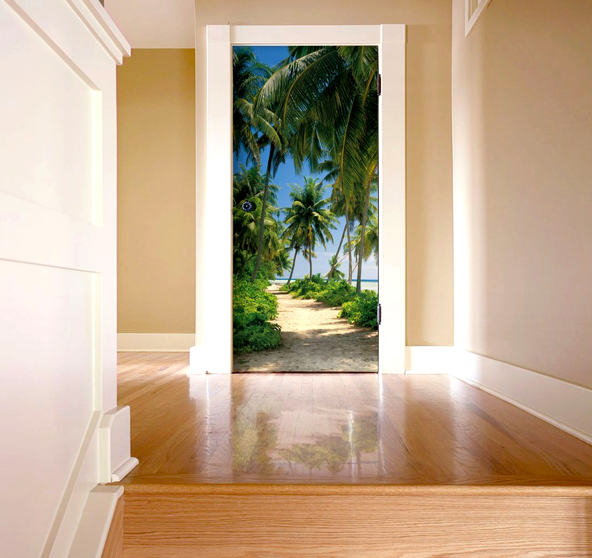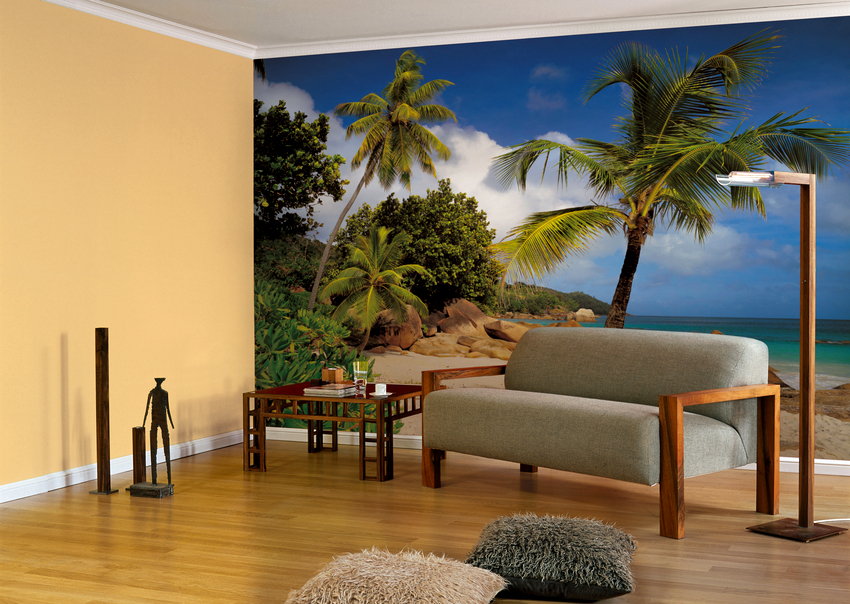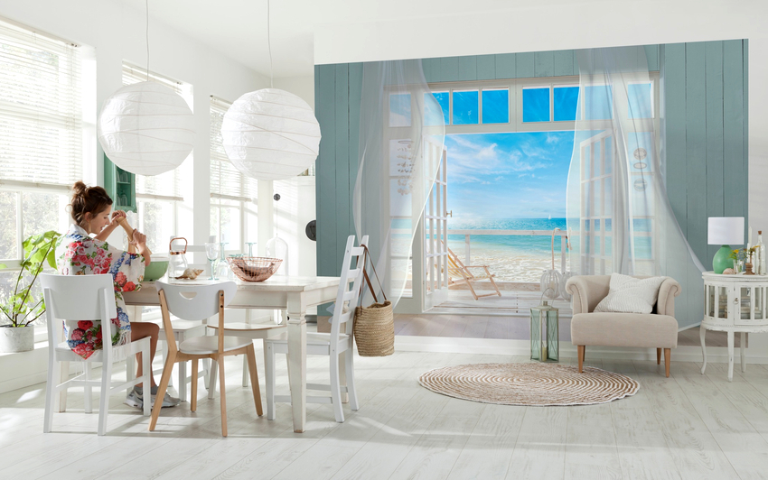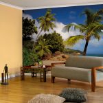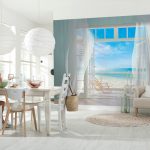 Photomurals of a marine theme in the form of beaches with palm trees and boats are suitable for decorating bedrooms and children's rooms. In the living room, made in a minimalist style, a photo with a view of the ocean will look great, and in a room for children - the sea with a pirate ship or an image of the underwater world.