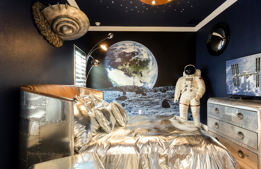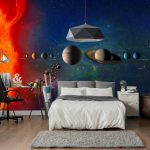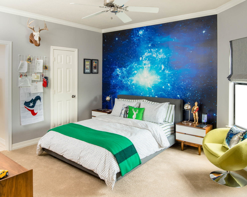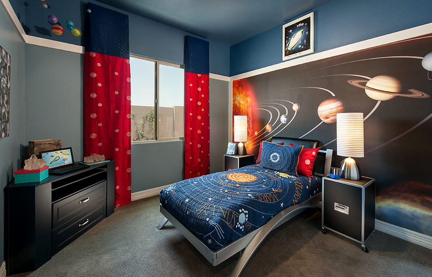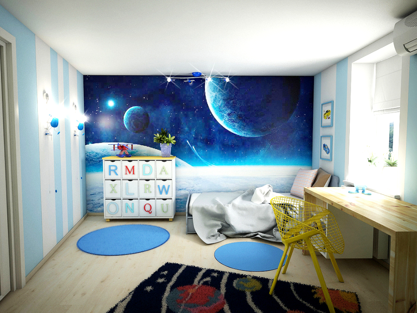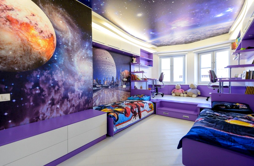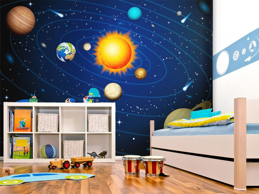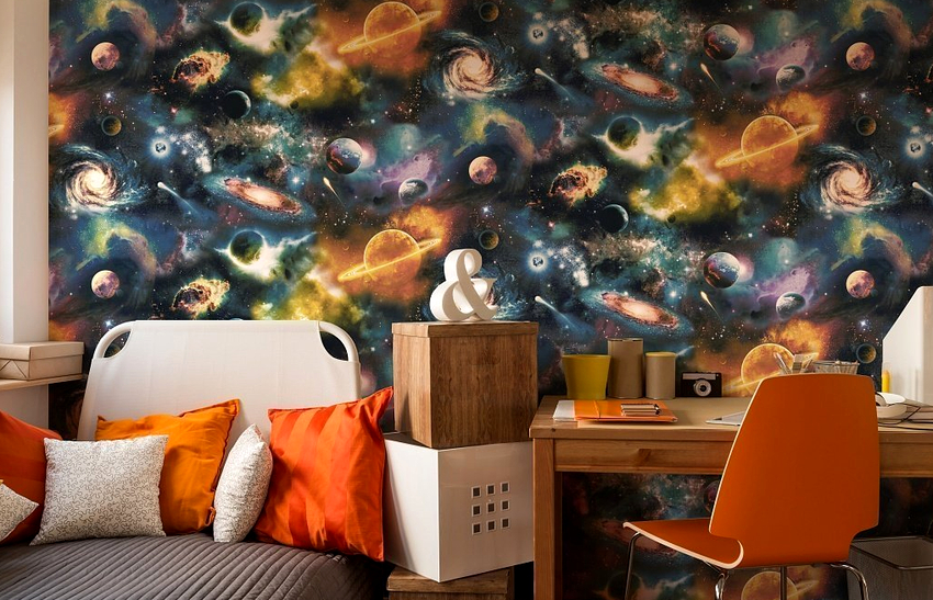 The space theme is less popular in comparison with the types of room decoration listed above, but this is just a matter of time, as the designers assure. Wallpaper with space personifies the mystery and infinity of the Universe, prompting one to think, which contributes to relaxation and quick sleep. That is why such wallpapers are most often purchased for decorating bedrooms and children's rooms.