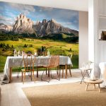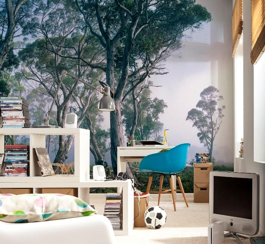 Natural theme in the interior: wallpaper forest, mountains, meadows and fields