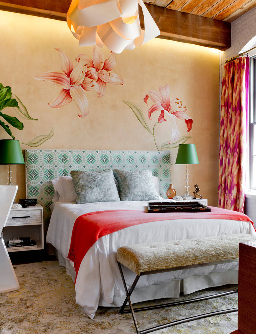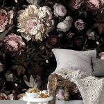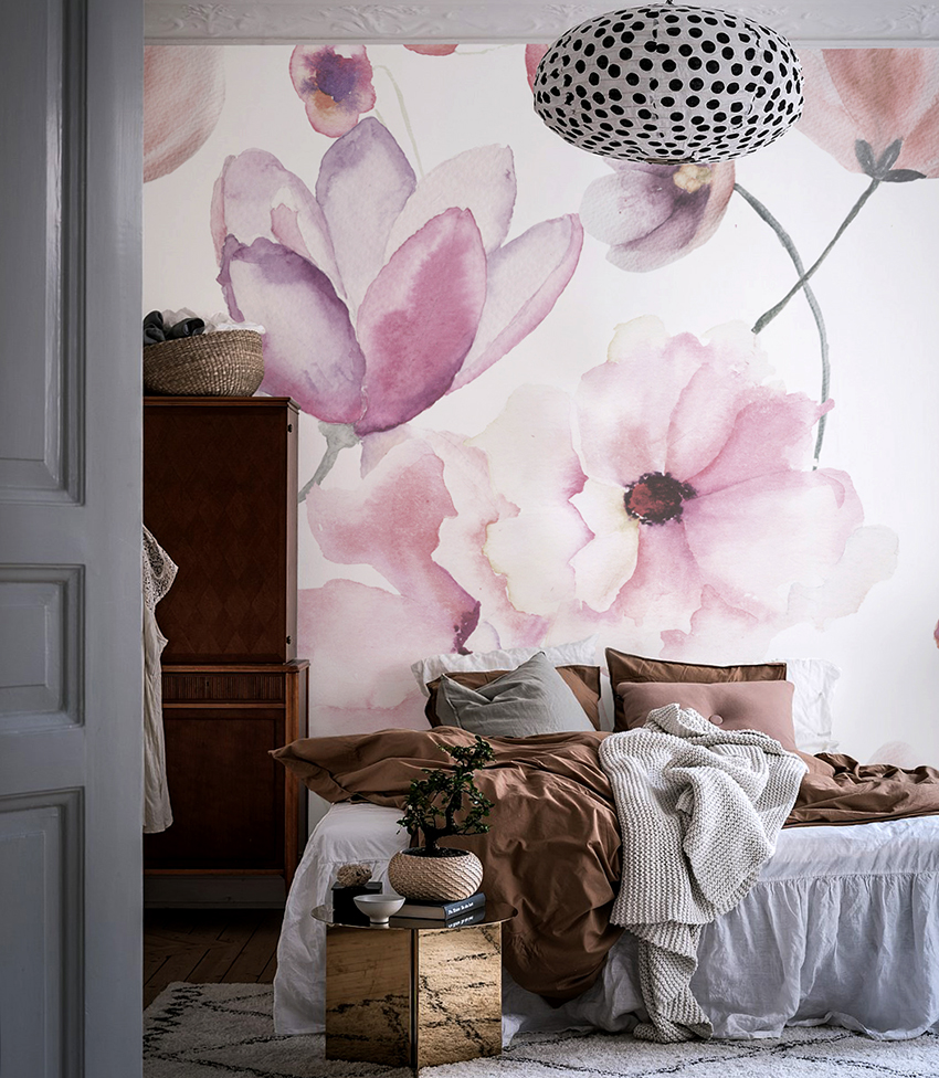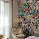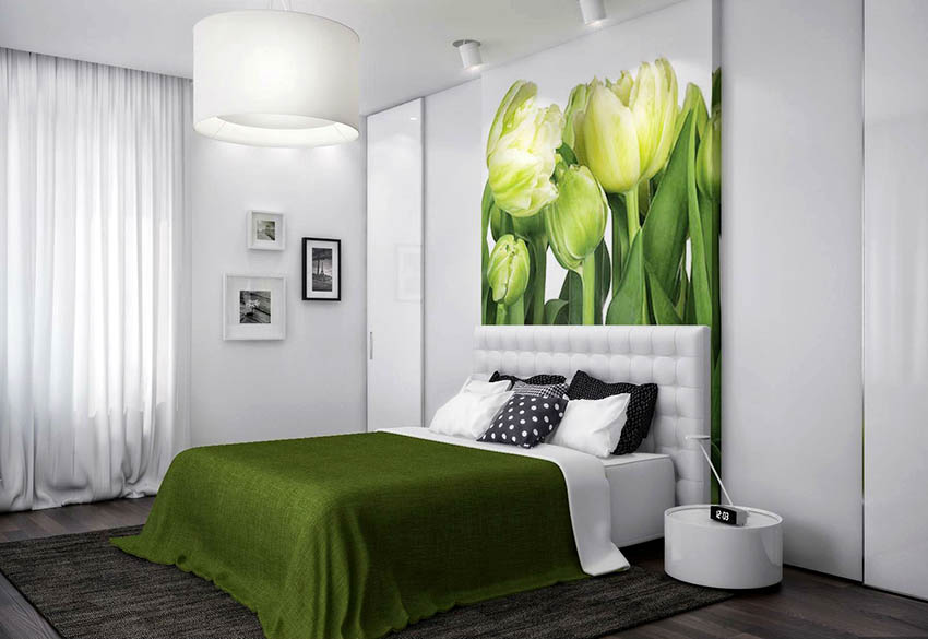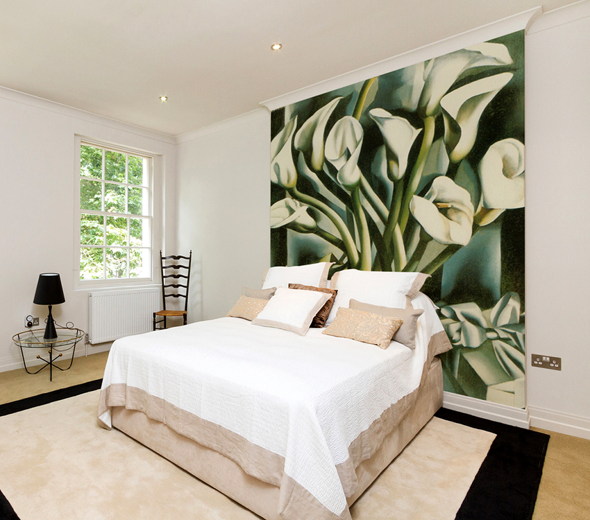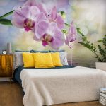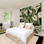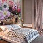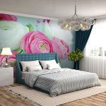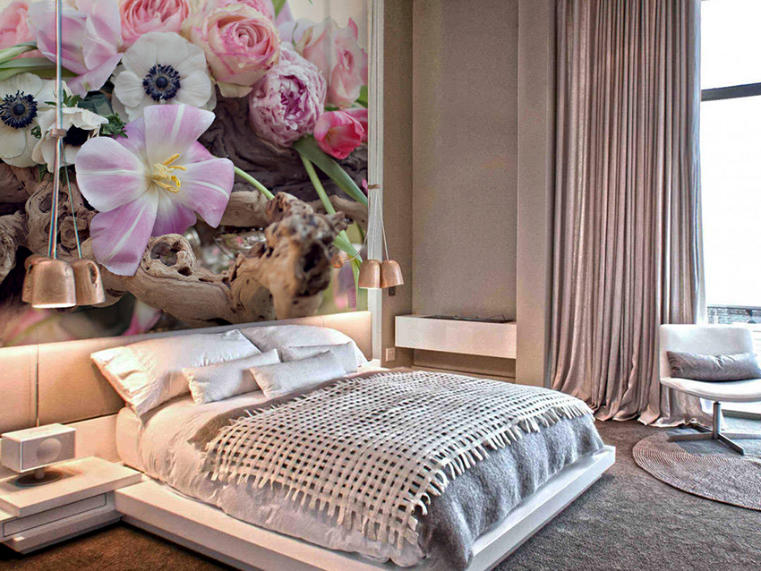 The next most popular after roses are peonies, whose voluminous flowers are associated with soft clouds. The bedroom, where such illustrations are present behind the headboard, is filled with cheerfulness and tranquility. In this environment, it will always be easy to relax and tune in to a positive day. Other flowers, images of which are often found in the interior of the bedroom: