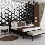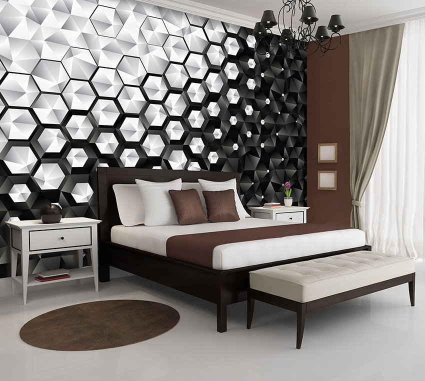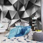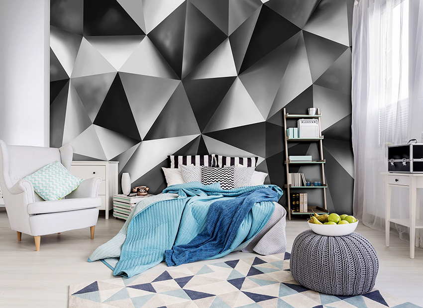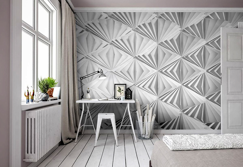 To create the effect of convex, concave or non-uniform walls with unusual curves, you can use 3D photo wallpaper in the bedroom. Such effects will be especially relevant in youth rooms. In an adult's room, murals with a painting or a bas-relief with an antique plot are often used on the wall. In this case, it is important to adjust the entire style of the room to the selected image.