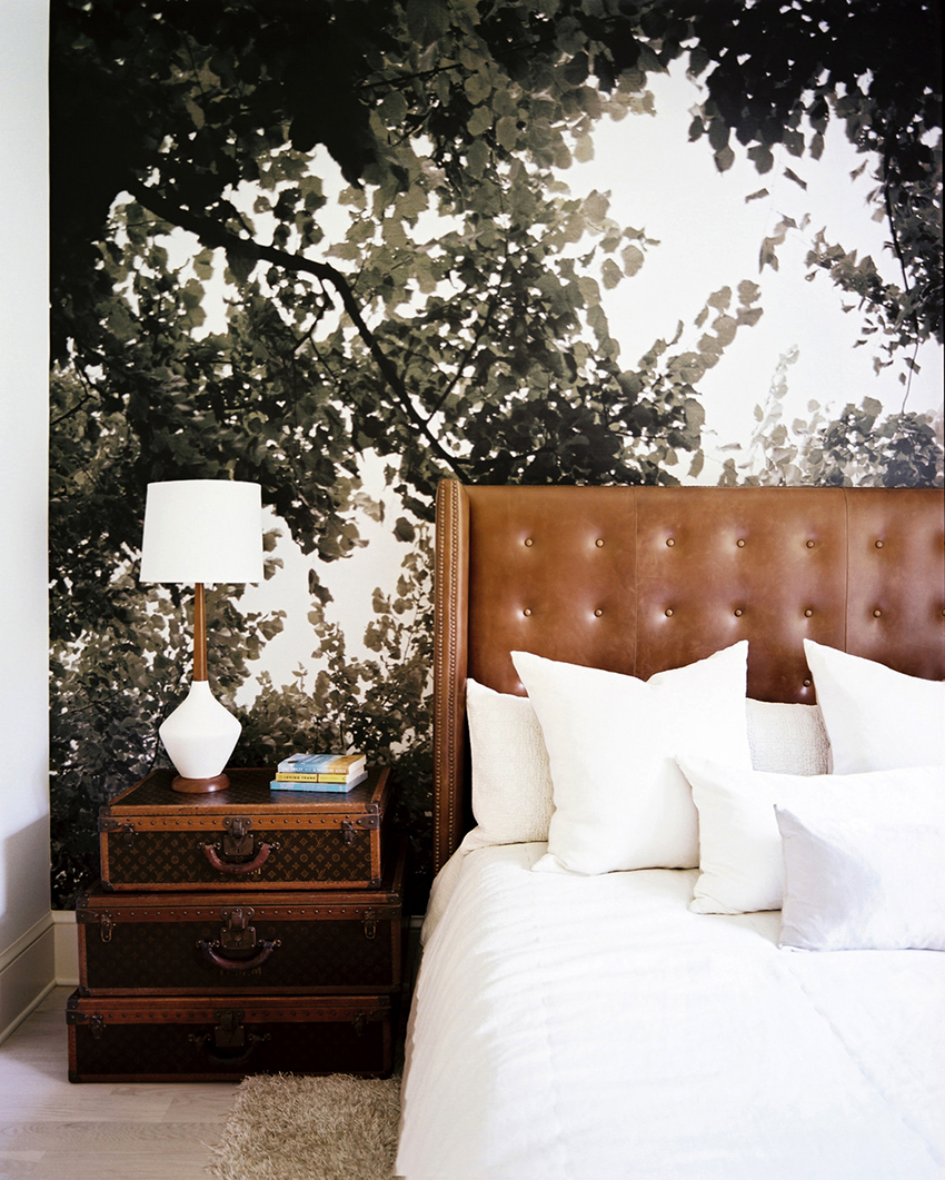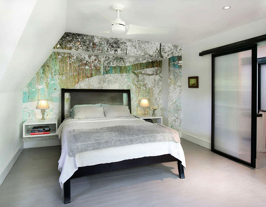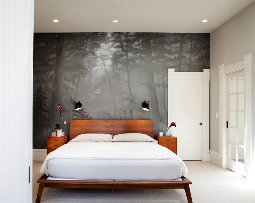 Traditionally, it is customary to mount photo wallpaper with a pattern above the head of the bed, but this rule is not decisive, so you can often see photo wallpaper on other walls, on the ceiling or even on the door. If you choose the right image, you can free the room from unnecessary decor and adjust the situation.