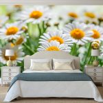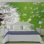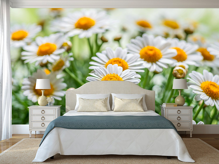 Photo wallpaper with the use of yellow and orange colors will bring notes of comfort, warmth and sunlight to the bedroom. Large yellow flowers in a large focus with dewdrops on a shaded background look especially beautiful. A field of yellow dandelions against a background of green grass with a chamomile highlighted in the center will be an appropriate accent detail. Such wallpapers will not get bored quickly and will positively influence the mood.
