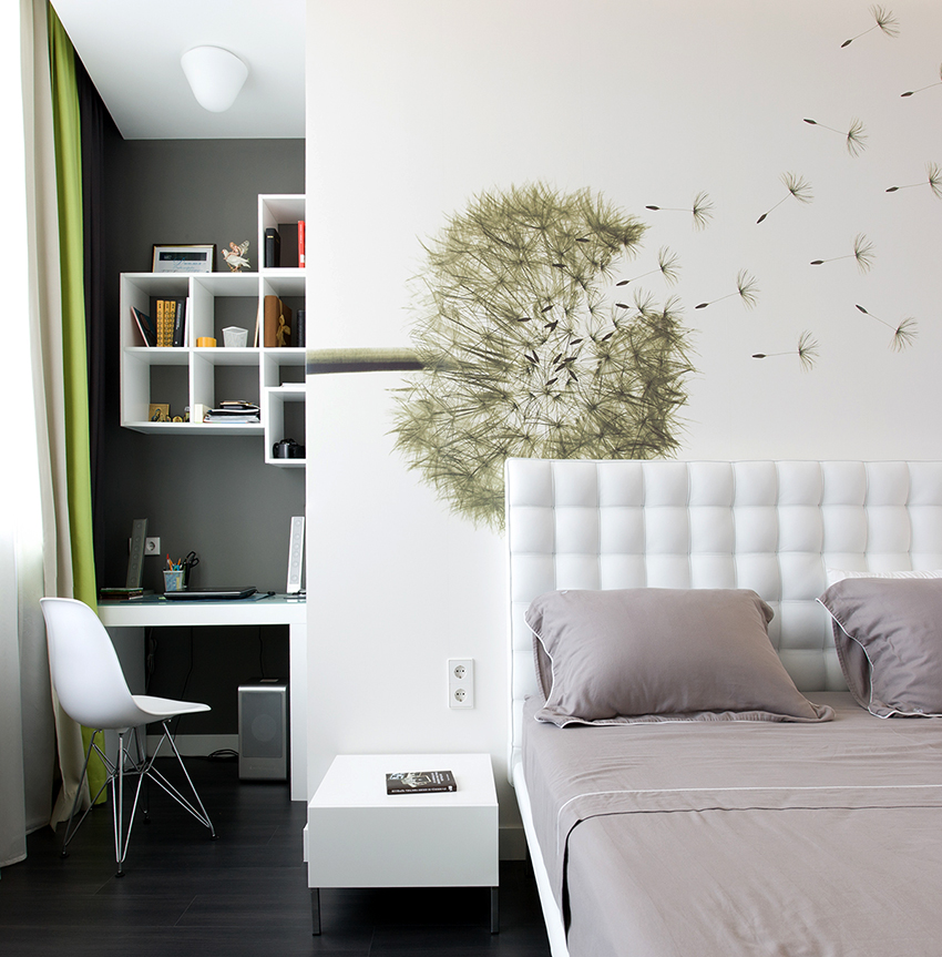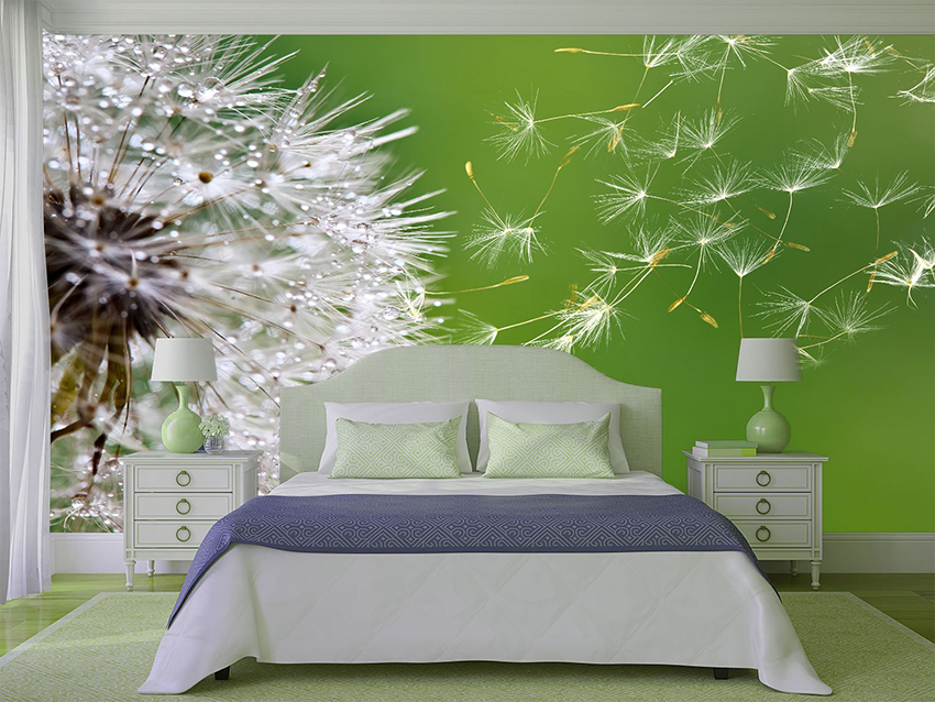Wallpaper of a neutral color with large decor cannot quickly get bored, the main thing is not to supplement such walls with small details. Dandelions with the effect of flying seeds look unusually beautiful on white wallpaper in the bedroom. Other rules for choosing colors: