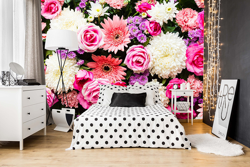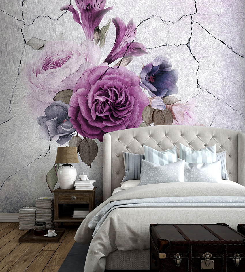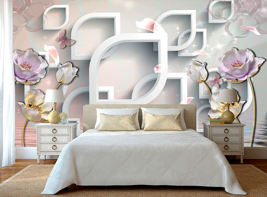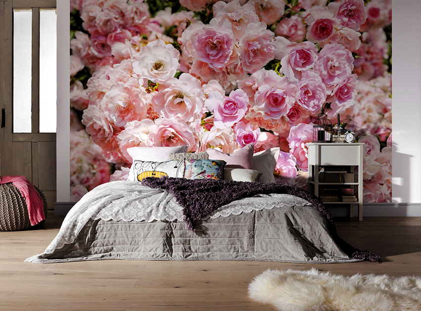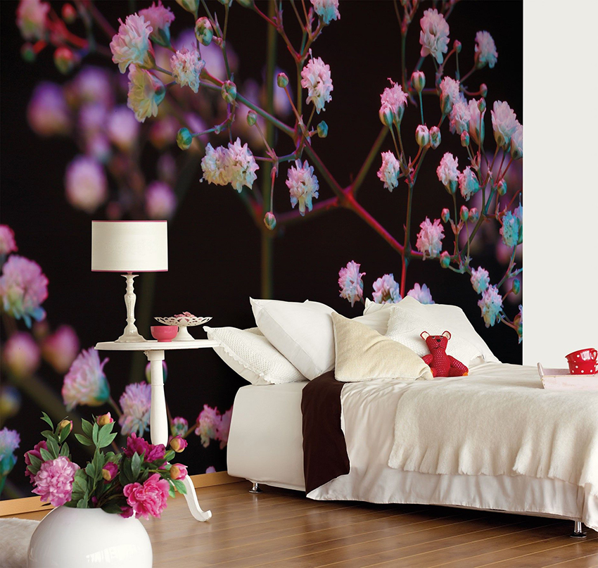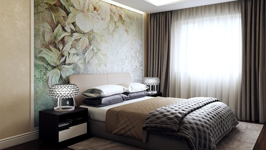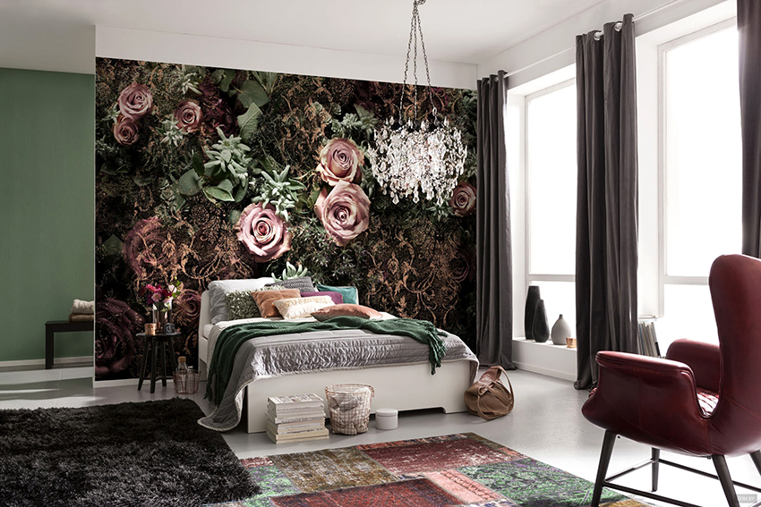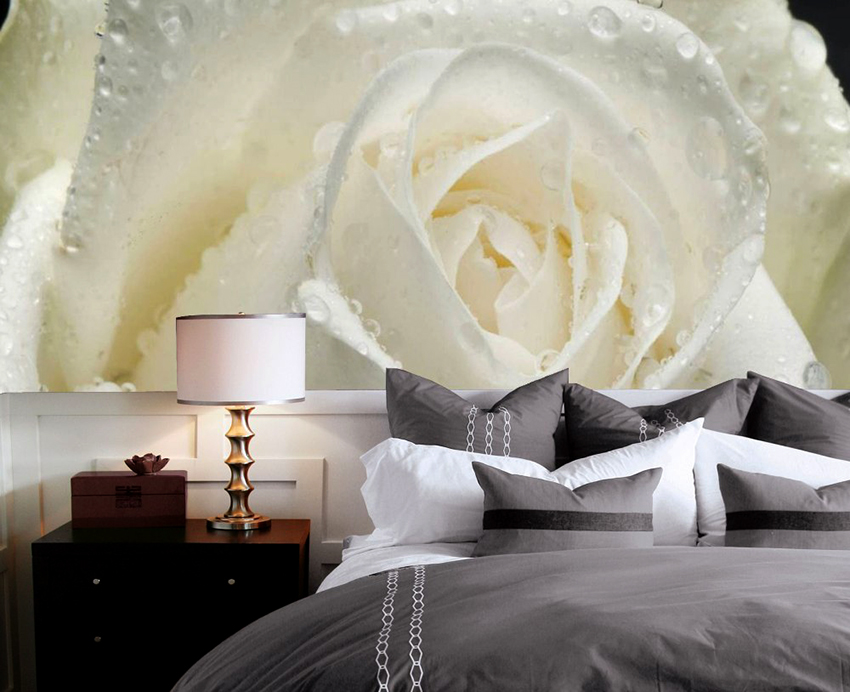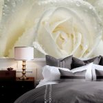 - In a large bedroom, where, in addition to the bed, there are no dimensional objects, you can show more imagination and glue murals with images made using macro photography. It is not recommended to use small pictures in a large open room that will get lost in space.