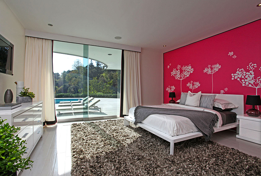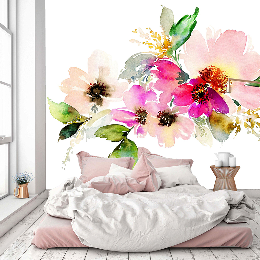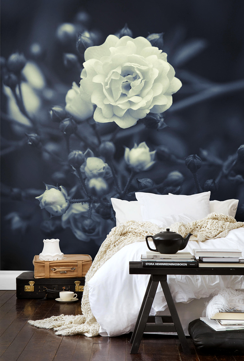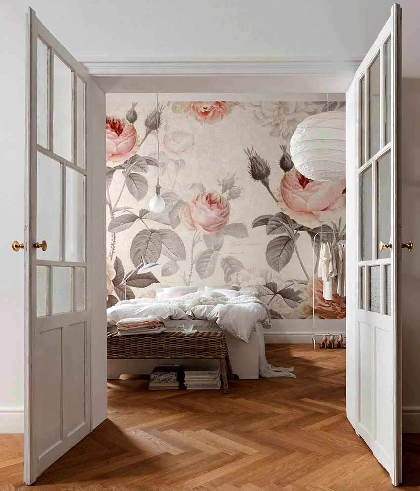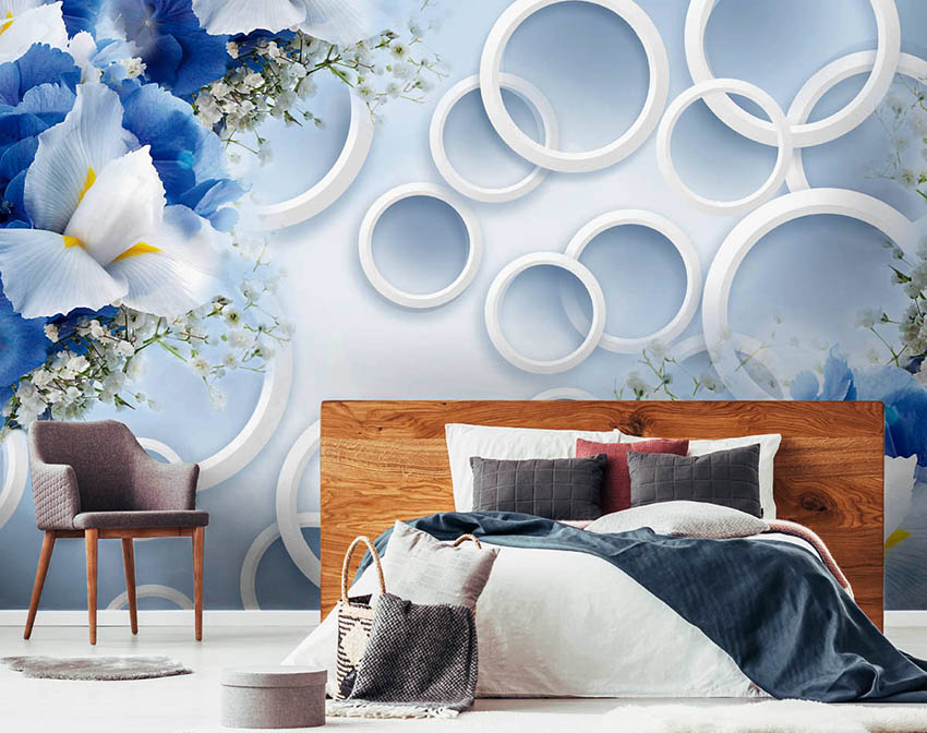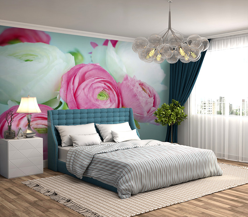 - In a large bedroom, where, in addition to the bed, there are no dimensional objects, you can show more imagination and glue murals with images made using macro photography. It is not recommended to use small pictures in a large open room that will get lost in space.