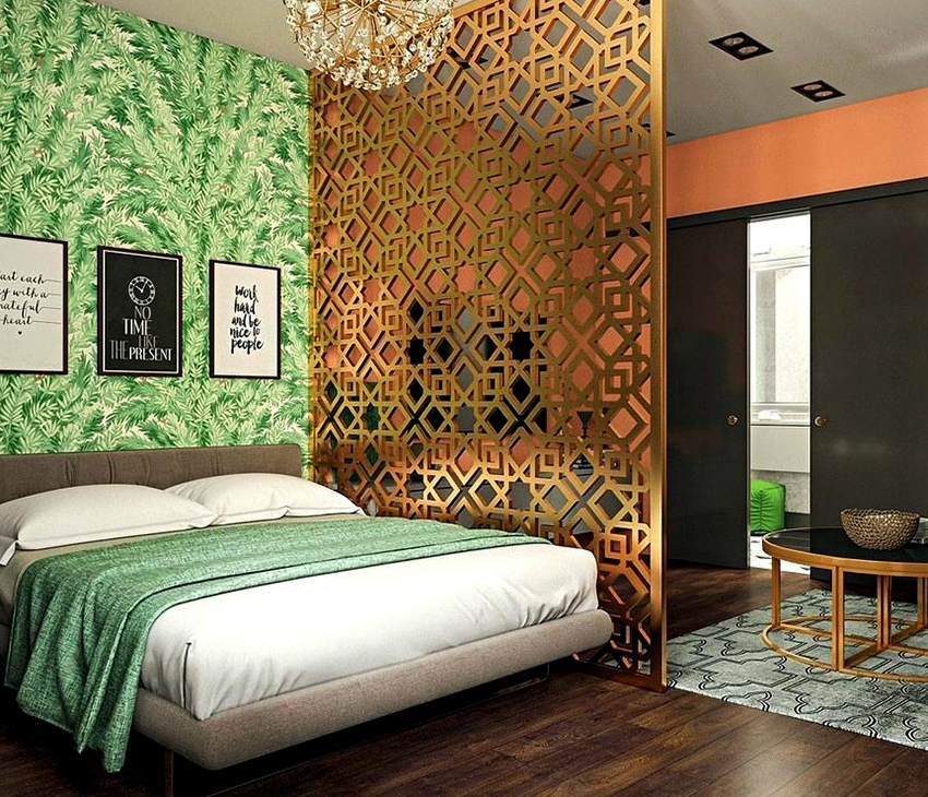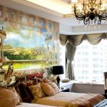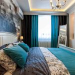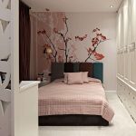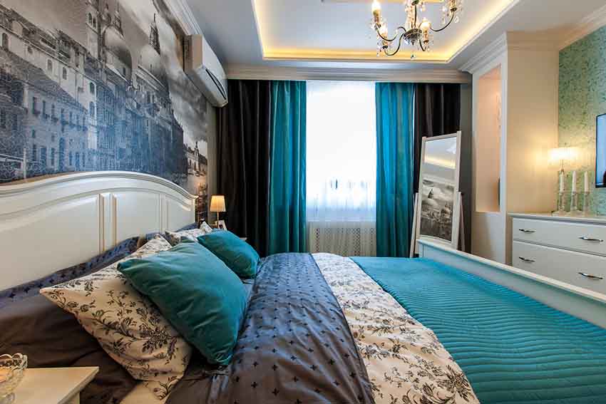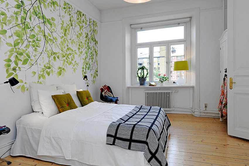 Also, in a small bedroom, you can often find wall murals on the wall with a window, depicting luxurious curtains made of expensive fabrics, and the windows themselves in this situation are closed with the help of Roman curtains similar in color. In this case, luxury is added to the interior without using extra centimeters of free space, the budget for buying real expensive curtains is saved.