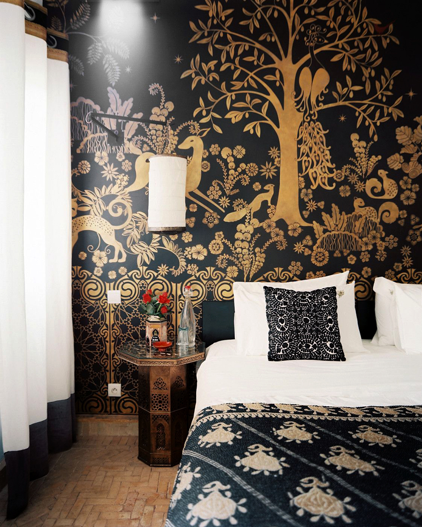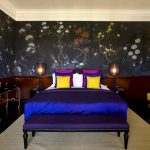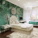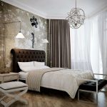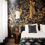 - Using patterns, various monograms, curls and weaves on the wallpaper, you can turn the bedroom into a real theater hall. If the wallpaper is supplemented with the help of burgundy, blue colors, gold decorative elements are added, then the bedroom will look like a palace one.