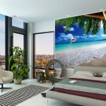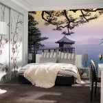 Pictures for wallpaper are usually distinguished by a variety of applied shades, around which there is a basic neutral color. In modern bedrooms, a neutral gray or silver color is increasingly used, which can be diluted with a landscape photo wallpaper in green or olive. It is appropriate to complement the beige, sandy and white walls with a seascape or use wallpaper with flamingos standing against the backdrop of a blue lake. As a result, the room will become more airy and fresh.