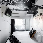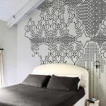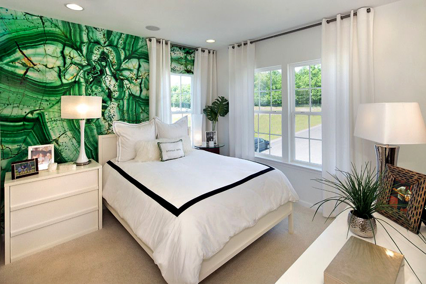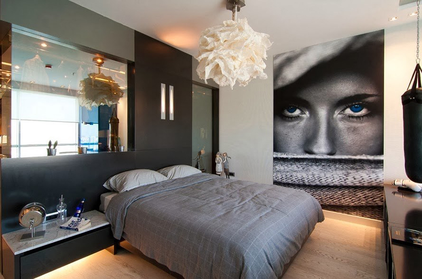 The unusual options include photowall-paper on glass, which is most importantly used in designer bedrooms. The basis of photowall-paper is made of tempered glass, the edges of which have undergone special processing, therefore this option is considered safe. Looking at the photos of bedrooms with photo wallpaper, you can see that decorative lighting is often used on the glass, installed in the background, which makes the image look unusual and bright.