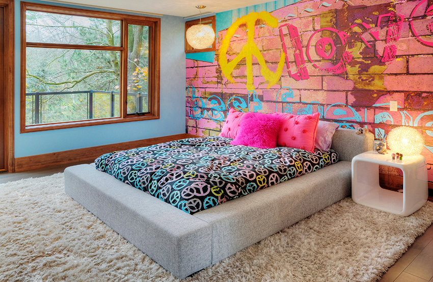 Wallpaper imitation of brick or masonry is ideal for a teenager's bedroom. It is especially good when the effects of dropped elements, holes, abrasions or protruding reinforcement are created on surfaces. Thus, it will turn out to create a stylish yet safe modern bedroom. If you use a combination of various photo wallpapers, then the teenage bedroom will also be successfully zoned. In this case, the masonry is used in the work area, and an image is applied on the wall above the bed, which corresponds to the mood and interests of the child. Other tips for choosing the trendiest wallpapers: