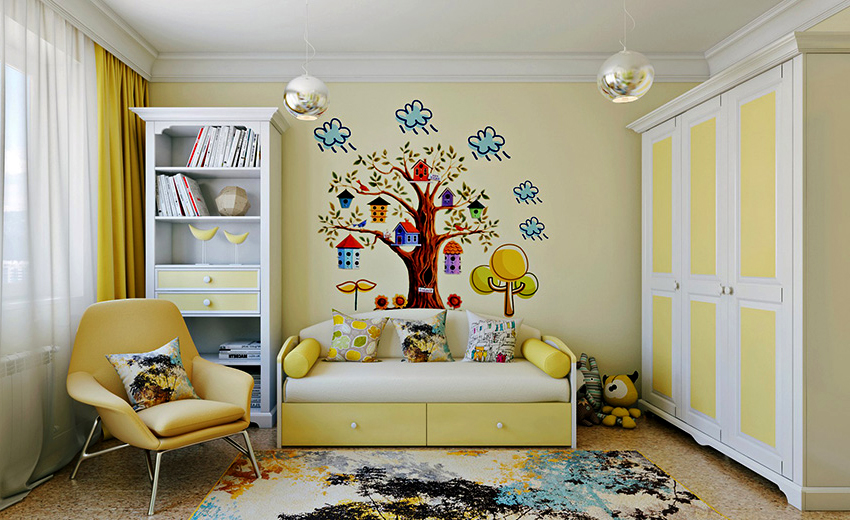 The universal color for the walls of the nursery is white, cream or shades of beige. Basic rules for choosing images for rooms of different parameters:
