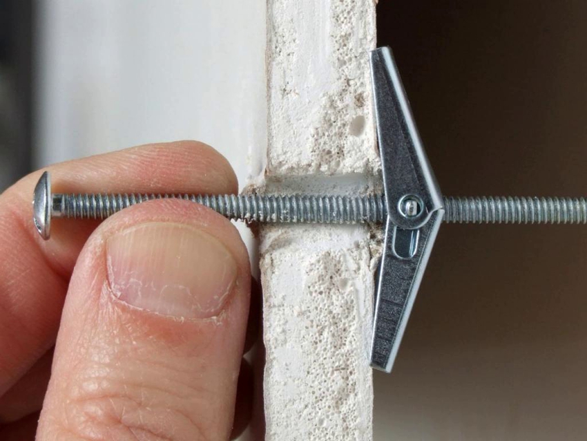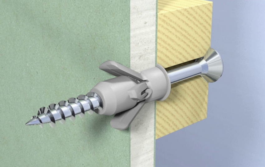 Before installing the plasterboard butterfly dowel, a through hole is made in the surface. A fastener is inserted into it, which opens on the back side in free space and abuts against the base when the self-tapping screw is screwed into it.
