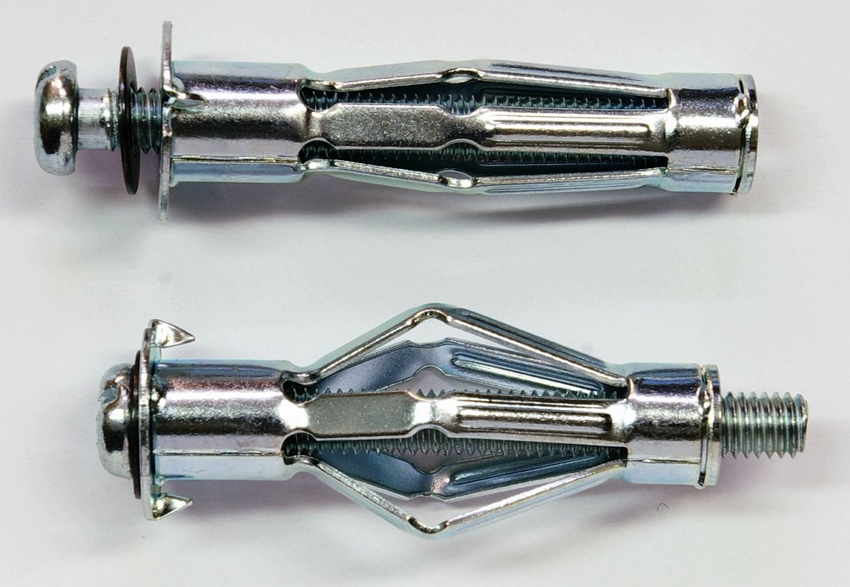 The umbrella dowel is inserted into a pre-prepared hole and opens up in the empty space after screwing in the self-tapping screw. Such a product is supplemented with a fastening hook or ring, due to which it is often used when installing chandeliers.