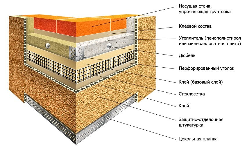 When installing insulation under plaster, for the walls of houses outside, expanded polystyrene, plates of basalt insulation, sheets of mineral wool or insulation foam are most often used as a heat insulator.