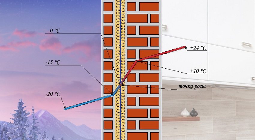 The dew point is the temperature at which condensation occurs. A point with this temperature can be located in the thickness of the wall, inside it or outside. Its coordinates depend on the physical properties of the wall materials, the thickness of their layers, as well as the external and internal temperature and humidity.