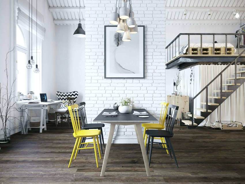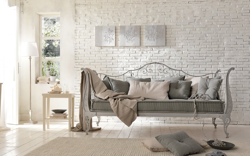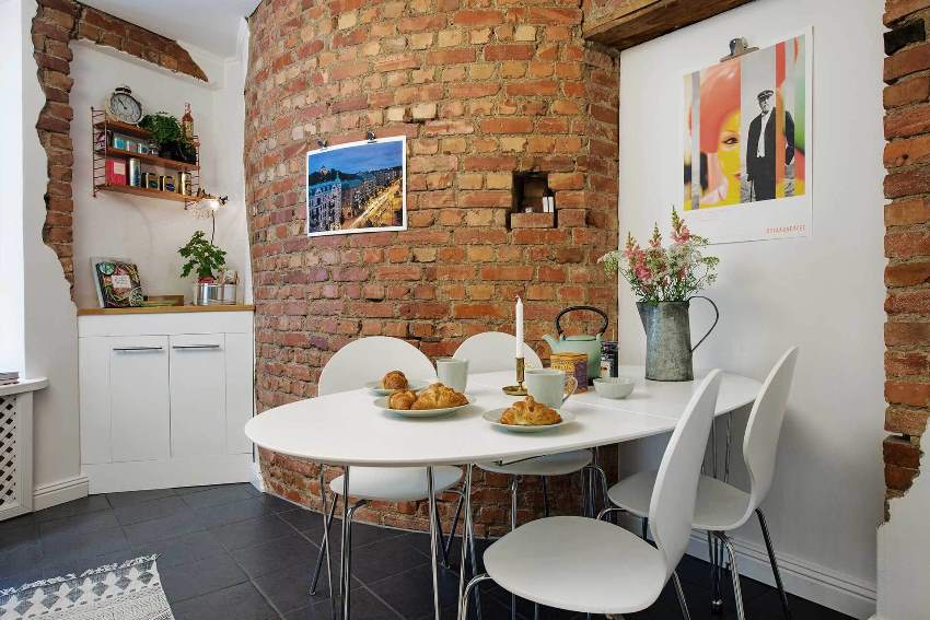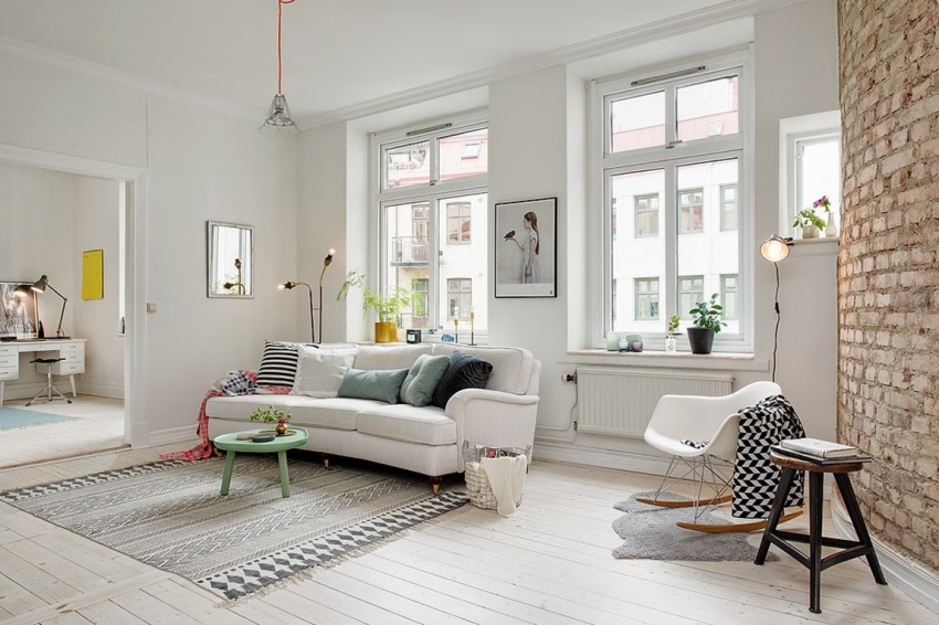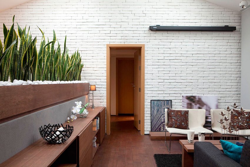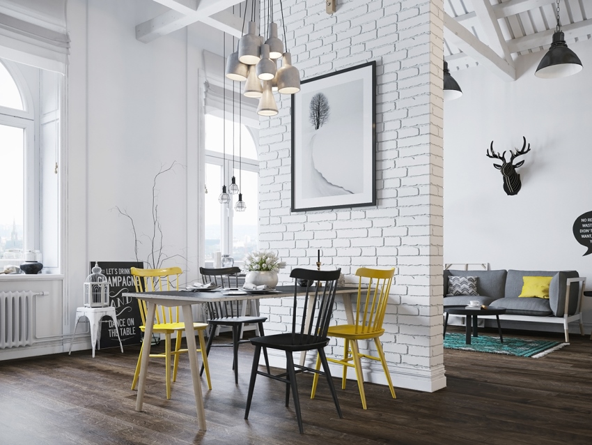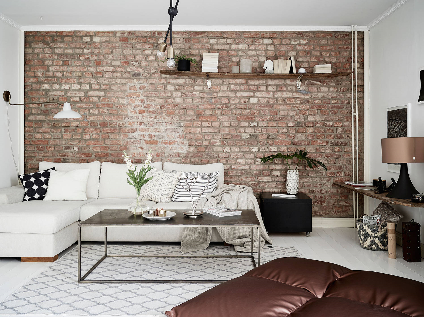 White is most often used in styles such as Scandinavian and minimalism. In both cases, the use of a light brick wall enriches the discreet decor of the room with minimal means. In this case, it is desirable to deprive the environment of color, so as not to overload the visual perception of the room.
