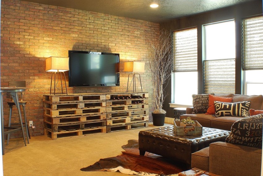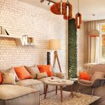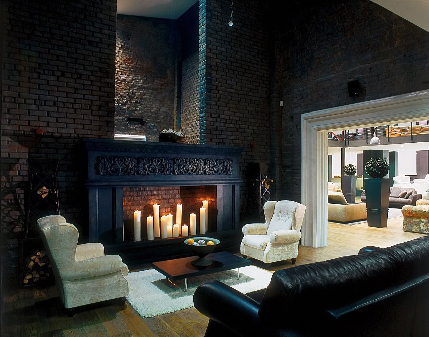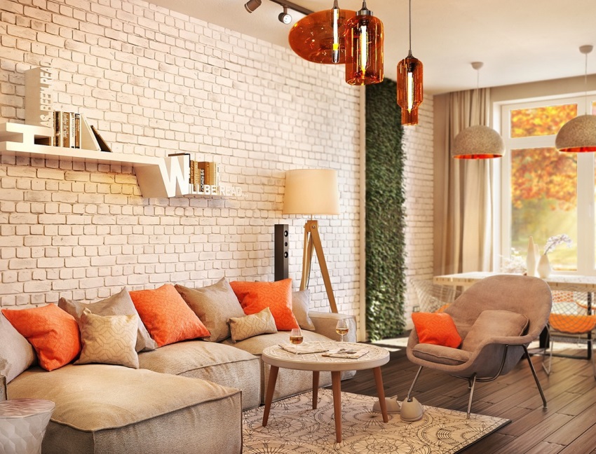 In the living room, a brick wall can be used as a backdrop for pieces of furniture, fine home appliances and decorative accessories. Many designers use a fireplace to create a cozy, comfortable and warm atmosphere in the room. In this case, the interior can be supplemented with a hand-made brick wall made of plaster or decorative gypsum bricks.
