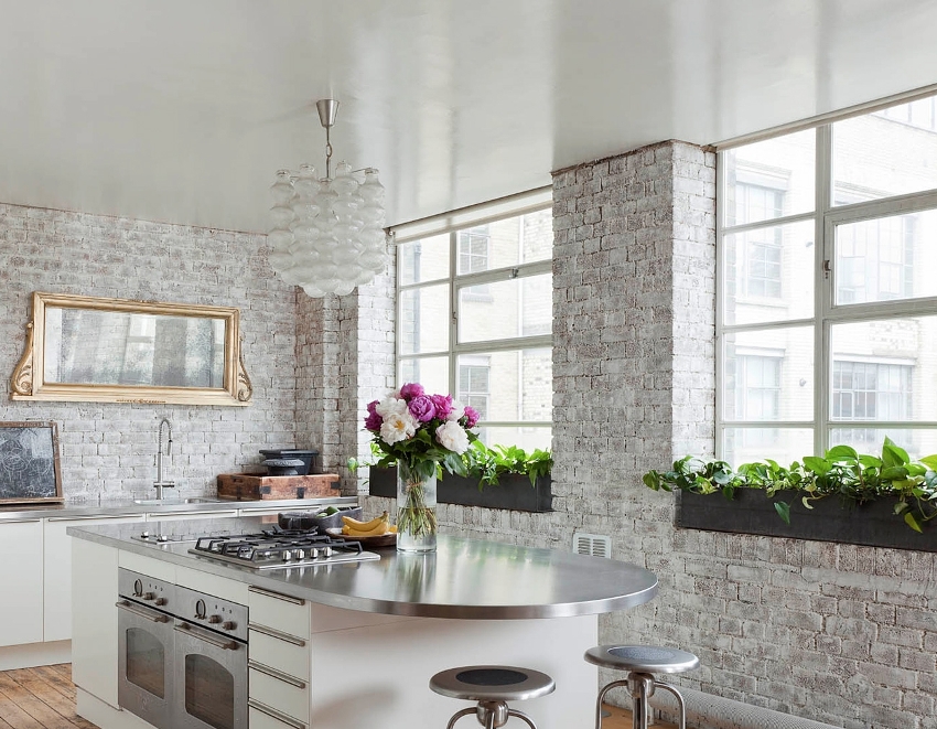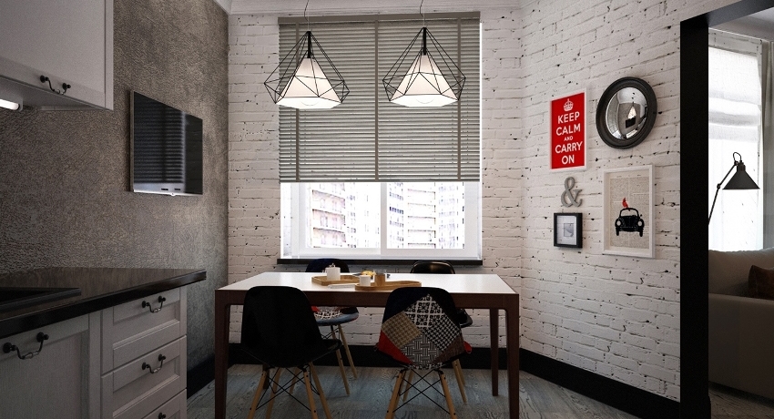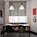 Kitchen design is almost unlimited. The brick in the interior of this room will originally emphasize the appearance of the existing equipment. With the help of decorative bricks, you can zoning the space and highlight the area where the dining table will stand.