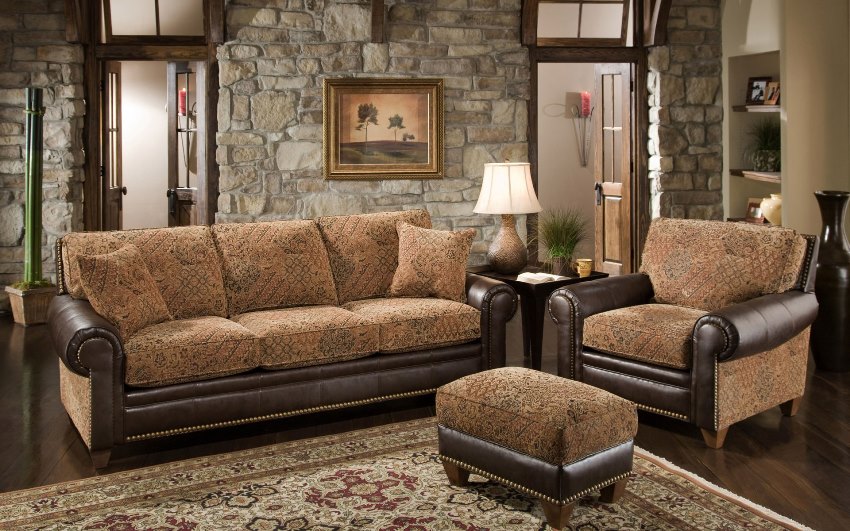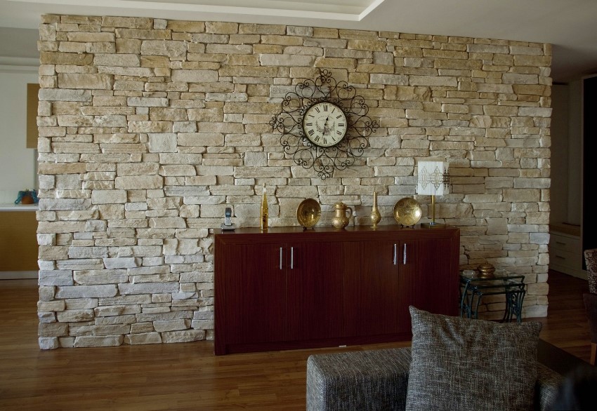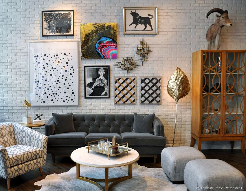 If a partial finish is required, a small area of the surface is covered with bricks. This method allows you to emphasize the solidity of the walls of the living room.