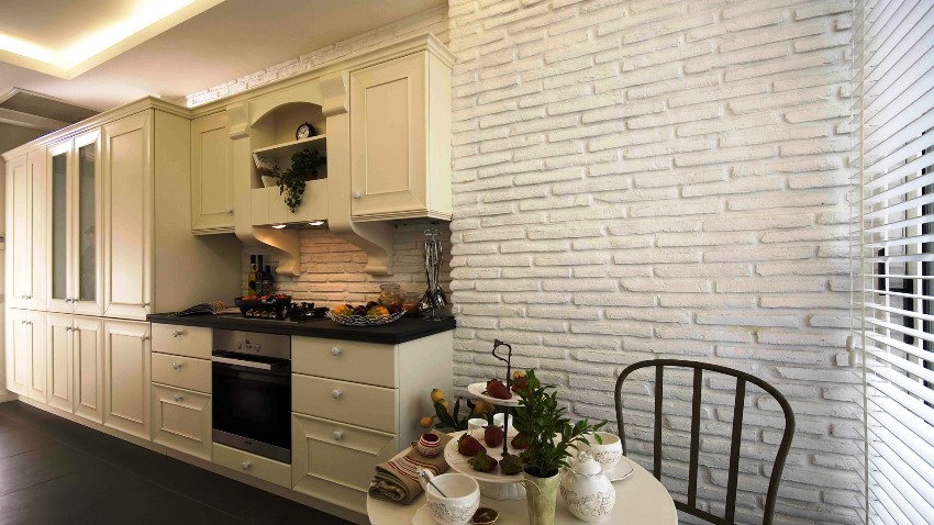 This material is strong, durable and environmentally friendly, available in a wide range of colors. Therefore, it can be successfully used both for creating a white brick wall in the kitchen and for finishing surfaces in the living room, bedroom, hallway and corridor. The material has the correct shape, which greatly facilitates its installation.