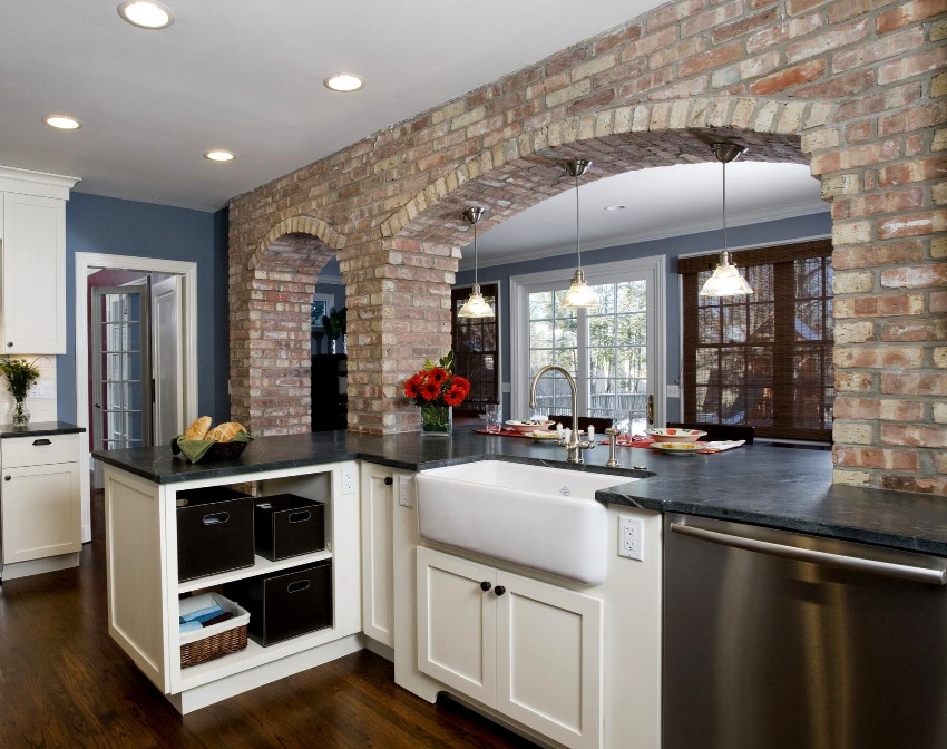 Individual architectural details can be made with bricks. Such an element can be a section of a wall located separately, an arch or bar counter.